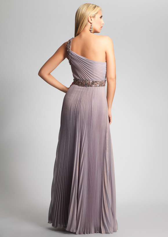Dave and Johnny Prom Dress 7905. Long Taupe pleated metallic chiffon with beaded waist band and beaded one shoulder strap.