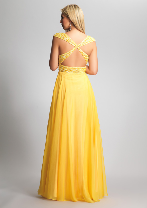 Dave and Johnny Prom Dress 8022. Long chiffon dress with sequin v-neck top and cut out back.Color Samples
