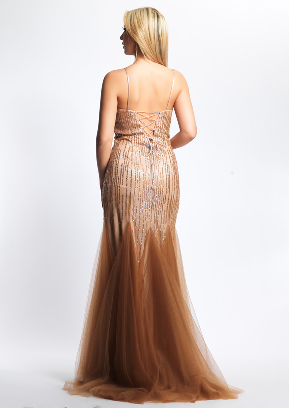 Dave and Johnny Prom Dress 8057. Long Beige beaded mesh dress with tie up back.