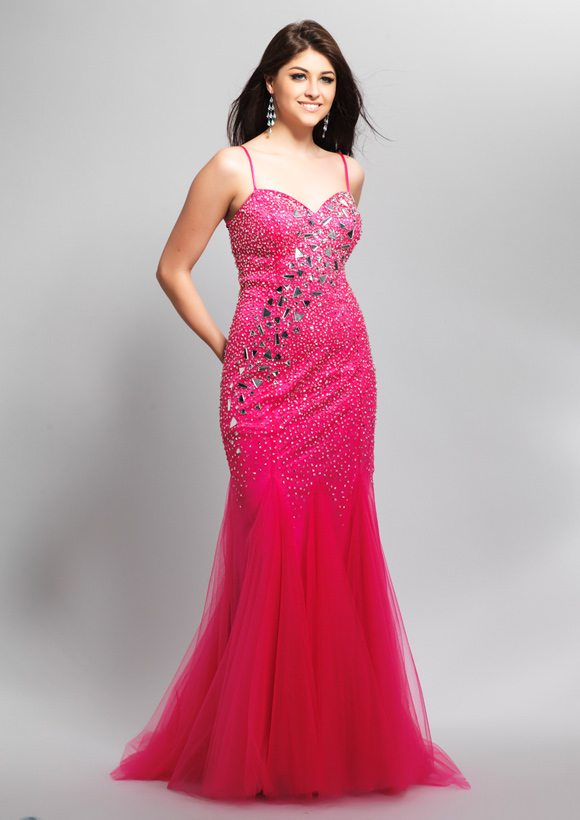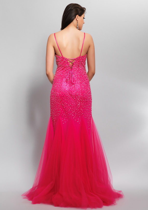 Dave and Johnny Prom Dress 8198. Fuchsia beaded and sequin mesh long dress with tie up back.