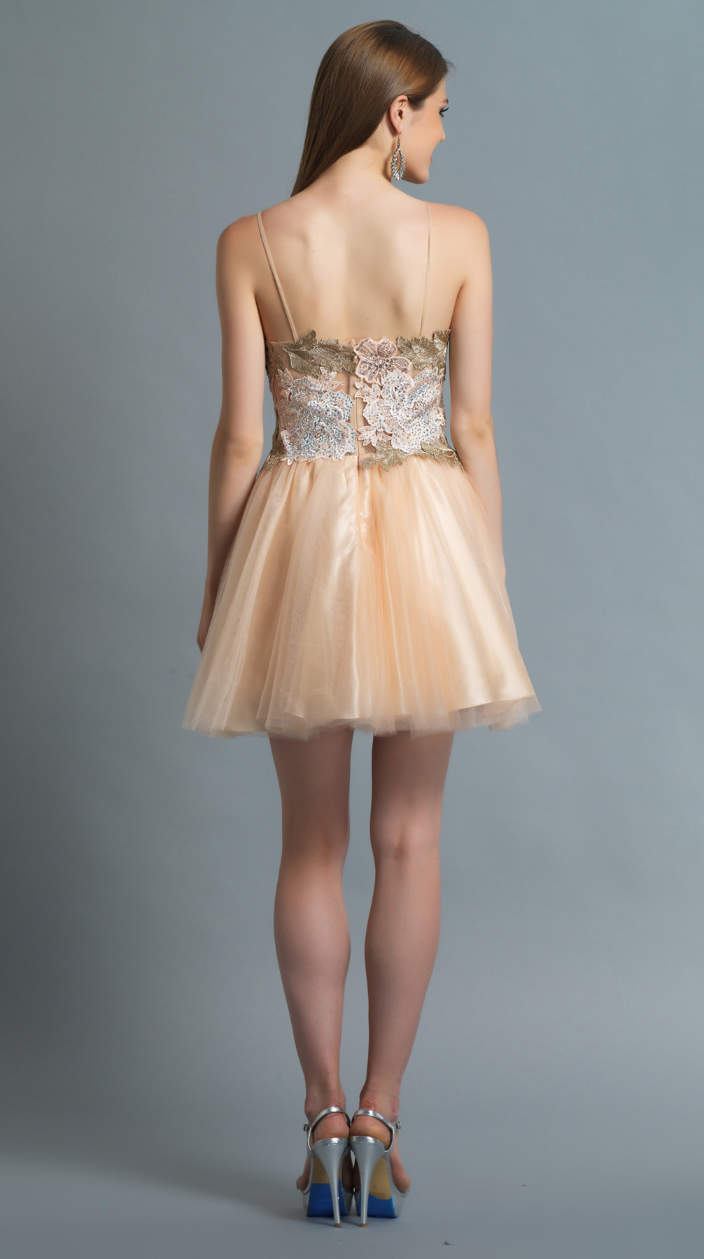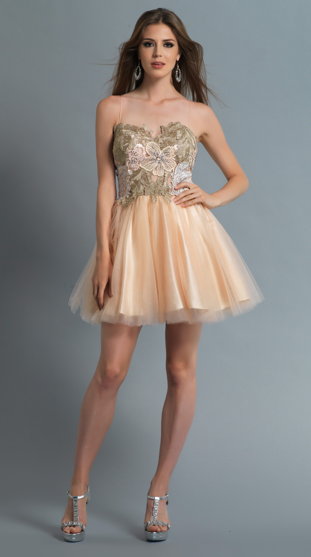 Dave and Johnny Prom Dress 849. Flare tulle bottom dress with lace bodice and spaghetti straps.