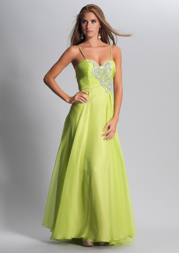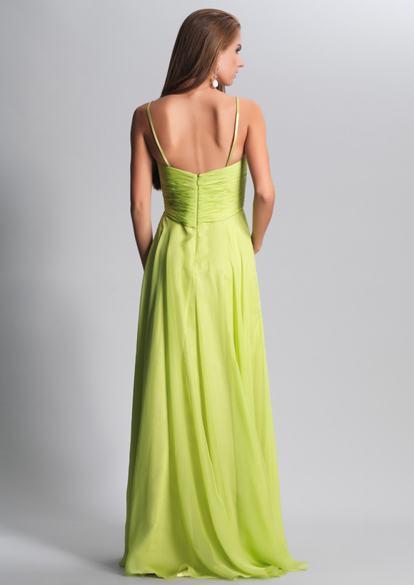 Dave and Johnny Prom Dress 8599. Long "Lime Green" chiffon dress with shirred and beaded top.