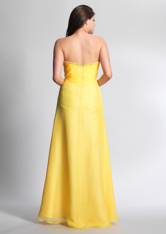 Dave and Johnny Prom Dress 8600. Long Yellow chiffon dress with strapless beaded neckline and waist embellishment.
