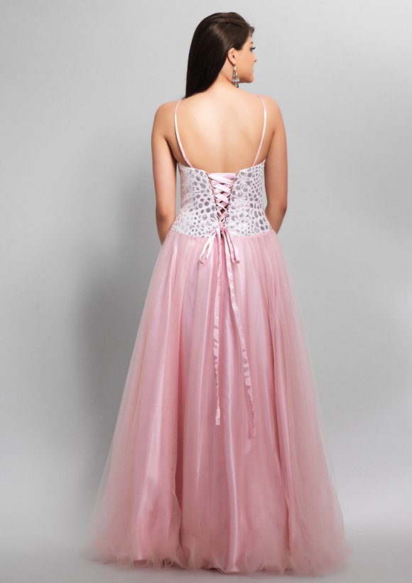 Dave and Johnny Prom Dress 8601. Long Pink tulle skirt with beaded sequined top and tie up back.