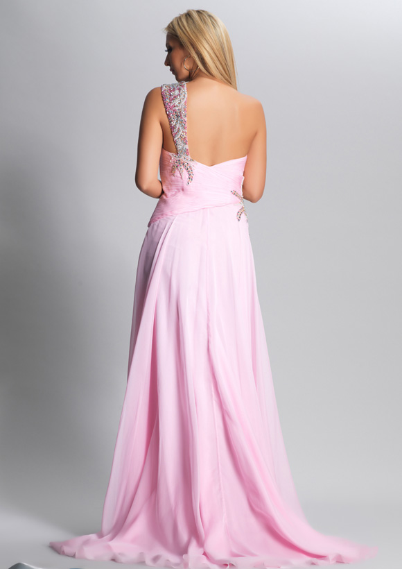 Dave and Johnny Prom Dress 8641. Long chiffon dress with side slit and beaded one shoulder and waist with shirred bust.Color Samples