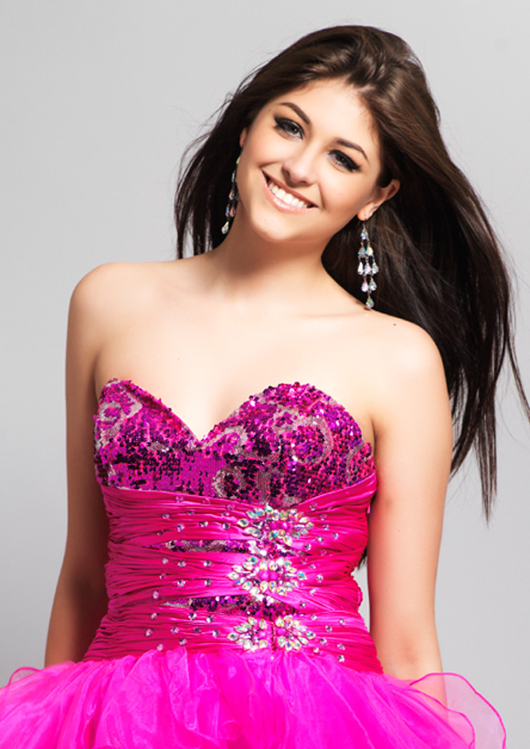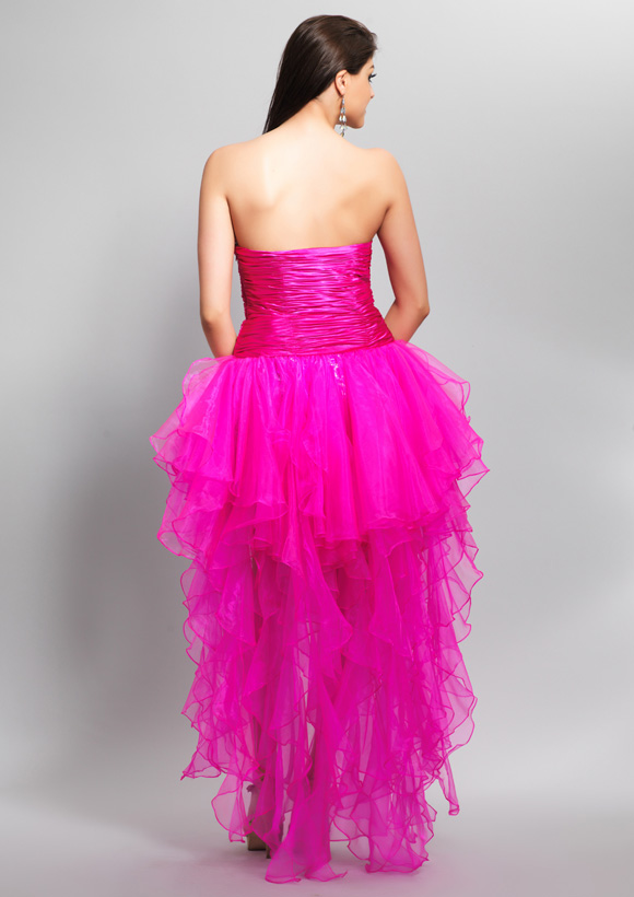 Dave and Johnny Prom Dress 8727. Fuchsia ruffled organza high-low over sequin short dress and beaded and shirred strapless top.As advertised from the manufacturer: www.Daveandjohnny.com.