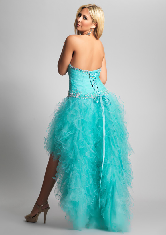 Dave and Johnny Prom Dress 8728. Mint ruffled tulle high-low with beaded bust and waist band with tie up back.