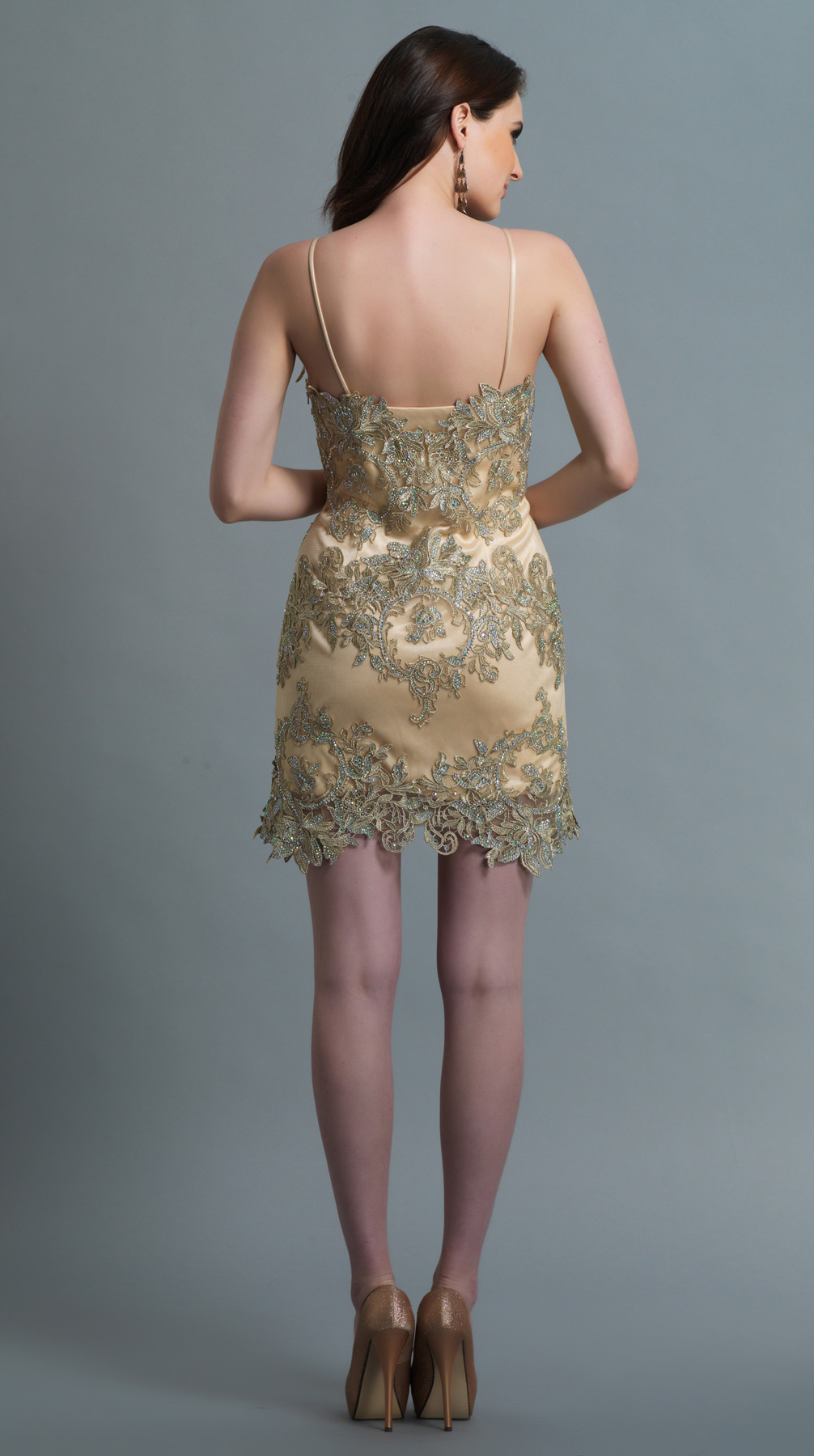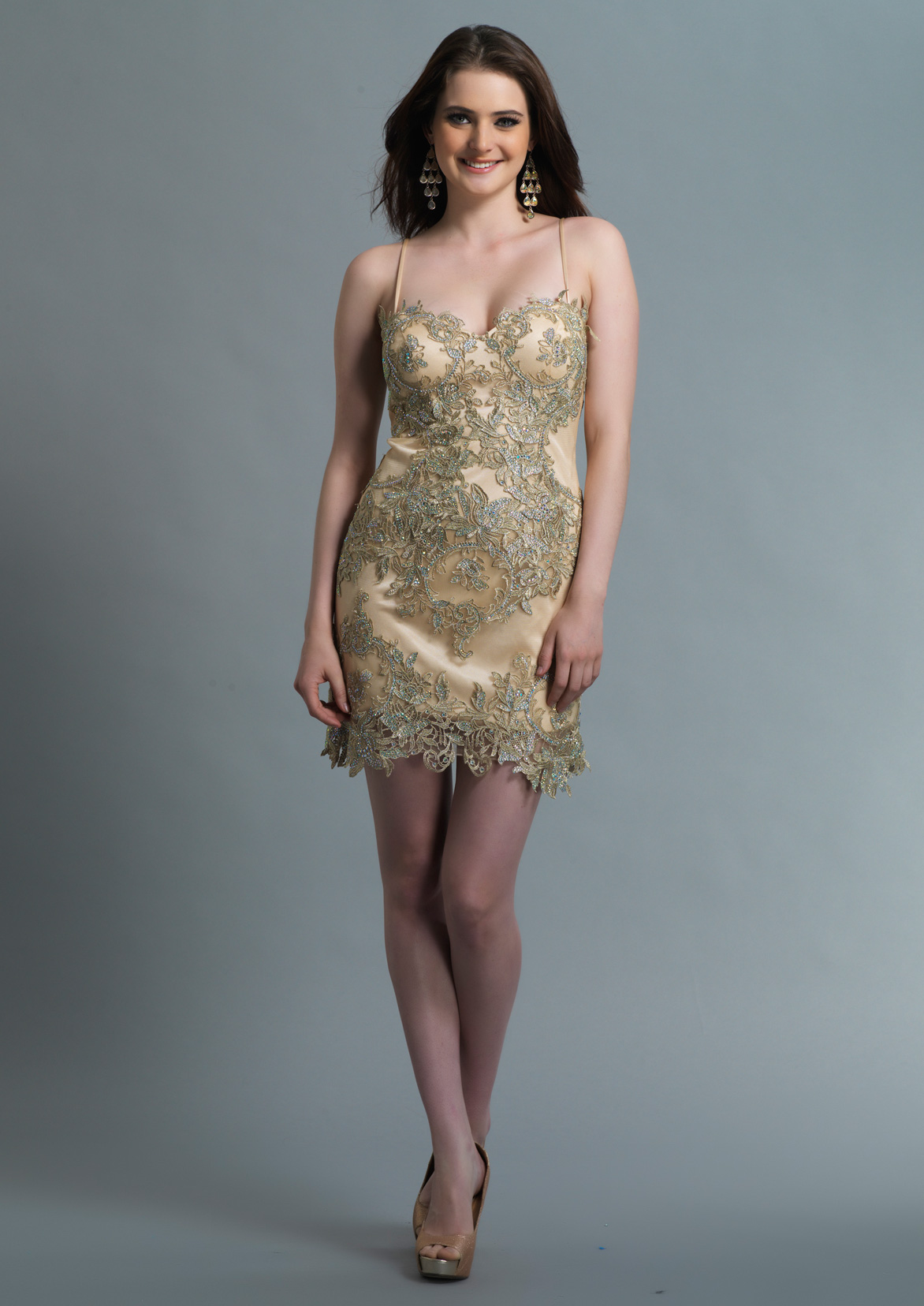 Dave and Johnny Prom Dress 887. Fitted dress with beaded lace applique has a sweetheart neckline and spaghetti straps.