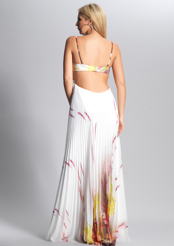 Dave and Johnny Prom Dress 8918. Long Print pleated chiffon with sheer beaded waist and shirred bust with cut out back.