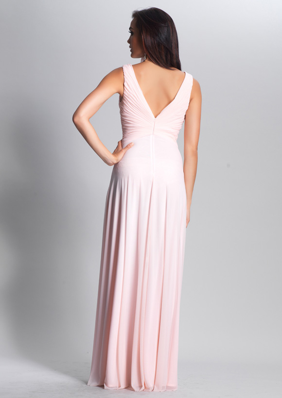 Dave and Johnny Prom Dress 8947. Long Pink chiffon dress with beaded neckline, shirred waist and bust v-neck.