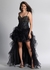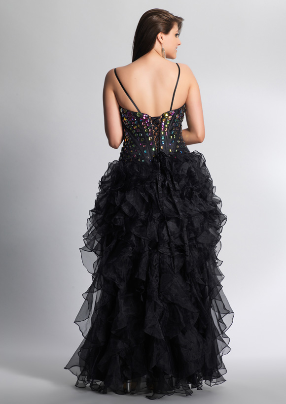 Dave and Johnny Prom Dress 9015. Black ruffled organza high-low with chunky rainbow jewels satin top and tie up back.
