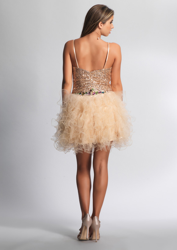 Dave and Johnny Prom Dress 9016. Short Champagne tulle skirt with Gold sequin and chunky rainbow beaded top.