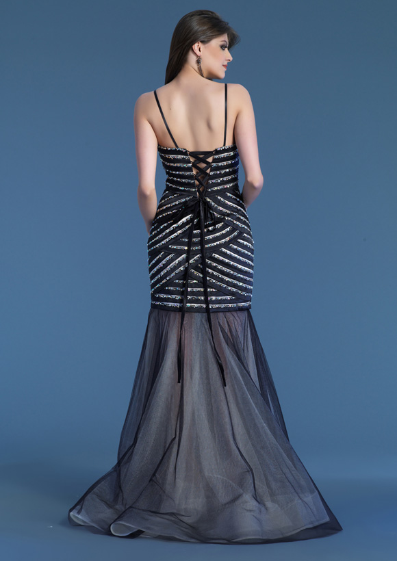 Dave and Johnny Prom Dress 9158. Long black and nude beaded satin top with tulle illusion skirt.