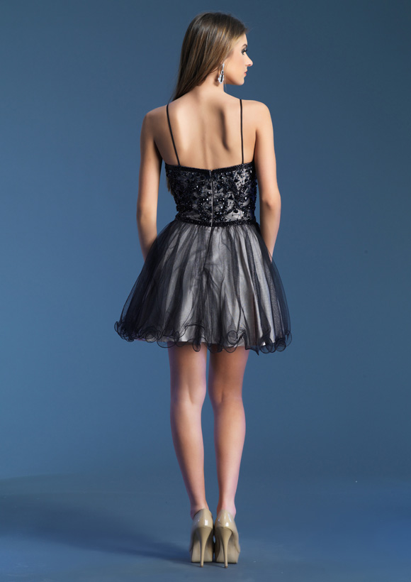 Dave and Johnny Prom Dress 9321. Short black and nude beaded tulle dress.