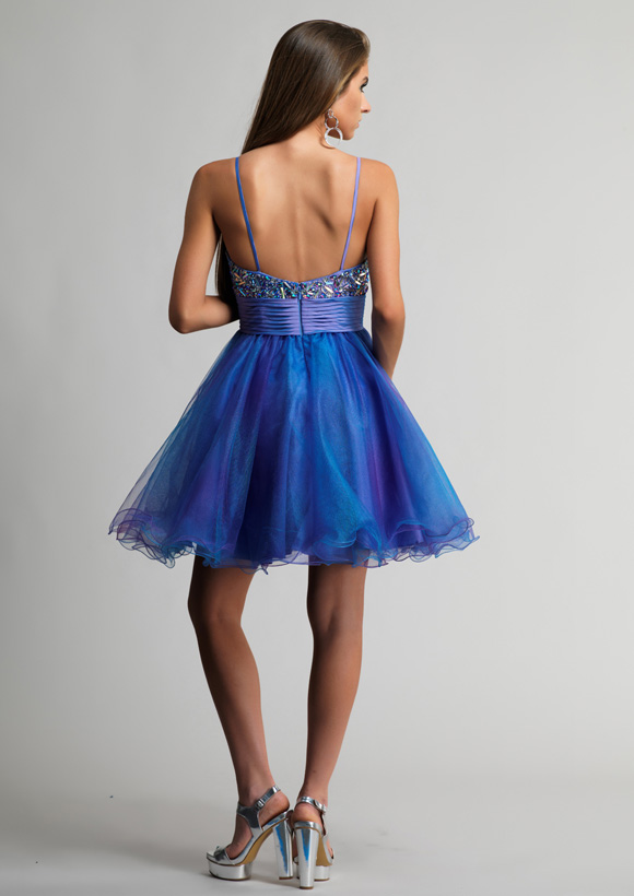 Dave and Johnny Prom Dress 9896. Short tulle dress with satin waist band and beaded sweetheart bust.