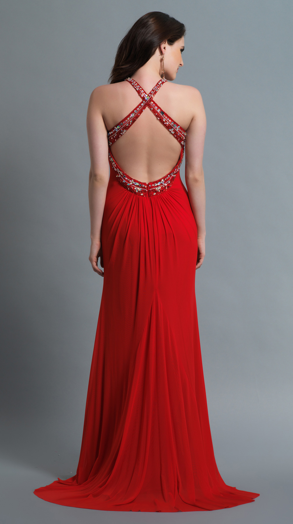 Dave and Johnny Prom Dress 991. Jersey gown with high waist has beaded bodice and criss-cross back.