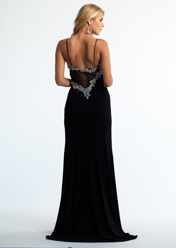 Dave and Johnny Prom Dress 9933. Long jersey dress with beaded top and sheer mesh back.