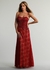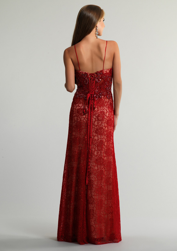 Dave and Johnny Prom Dress 9947. Long beaded sequin lace dress with sweetheart neckline and tie up back.