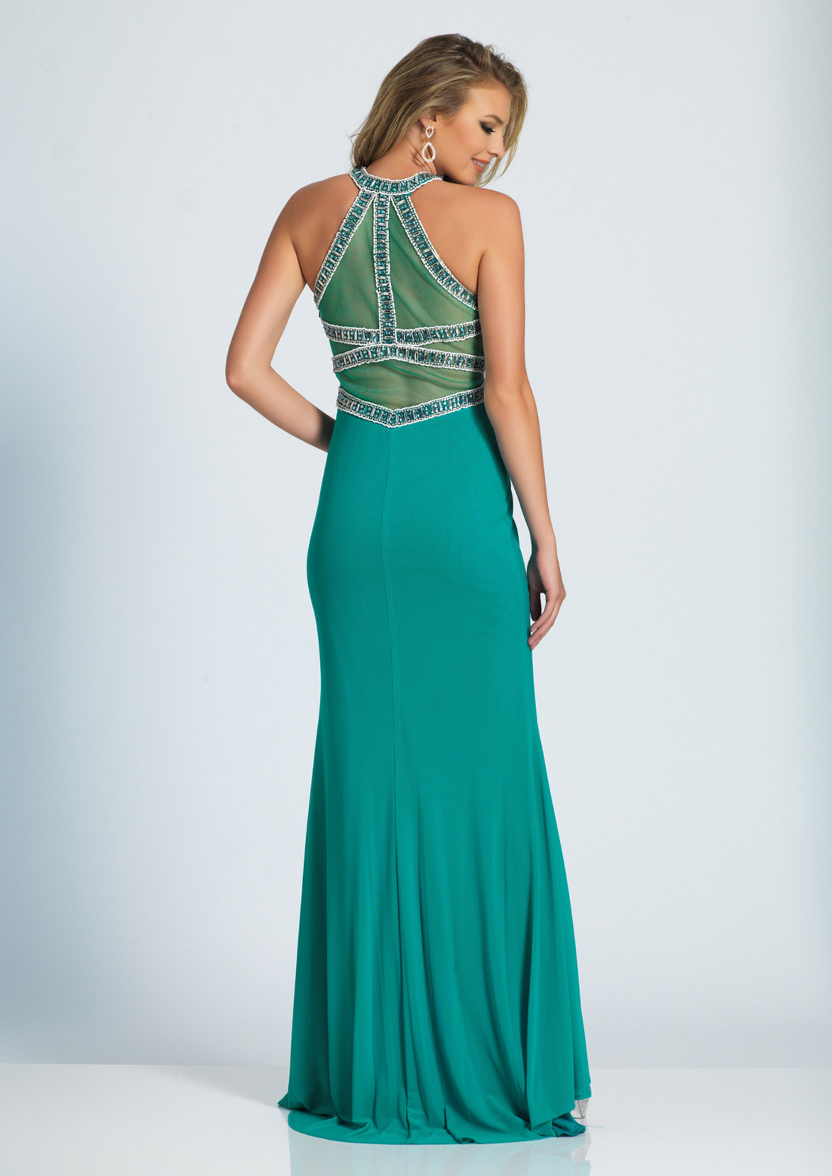 Dave and Johnny Prom Dress A4282. A high neck Jersey prom gown with a beaded bodice and high skirt slit.Fabric: Beaded Top/Jersey