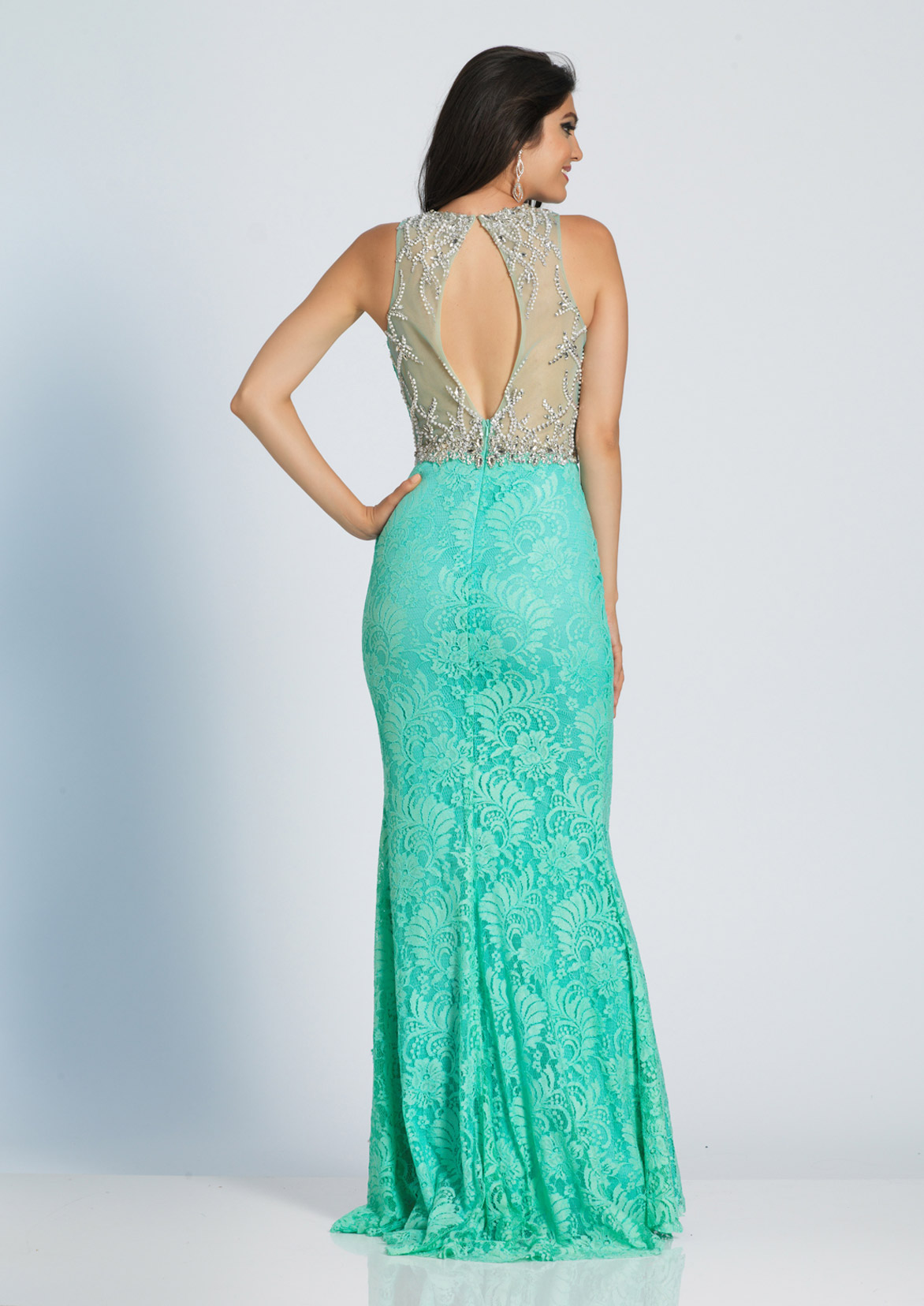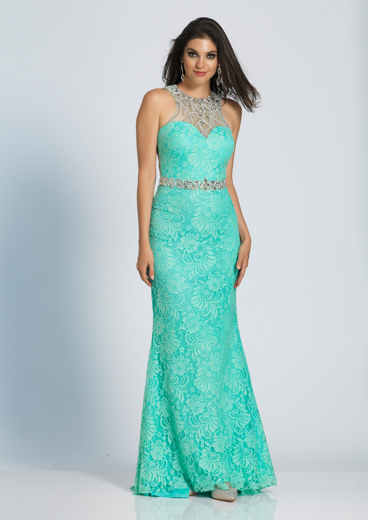 Dave and Johnny Prom Dress A4450. An allover lace evening gown with a beaded sheer high neck.Fabric: Beaded Top & Back/Lace