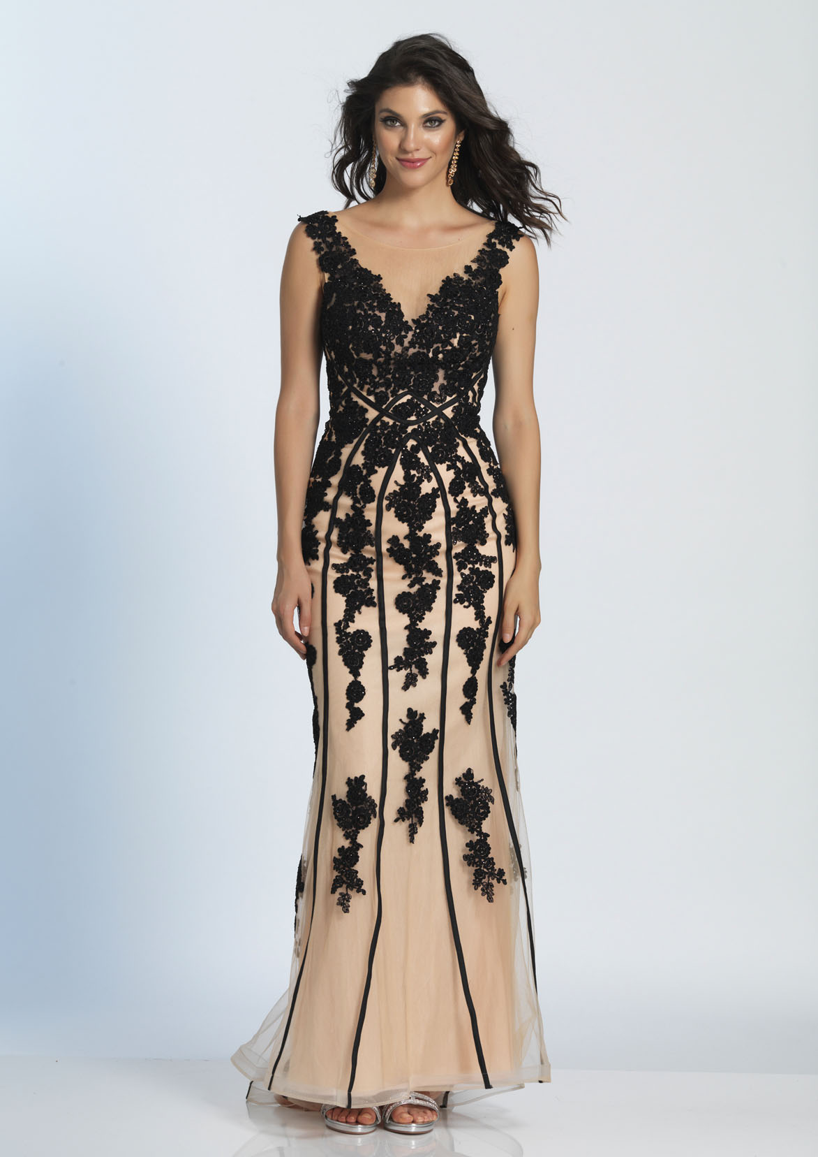 Dave and Johnny Prom Dress A4473. The fabric in this long prom dress style is Lace Over Tulle.