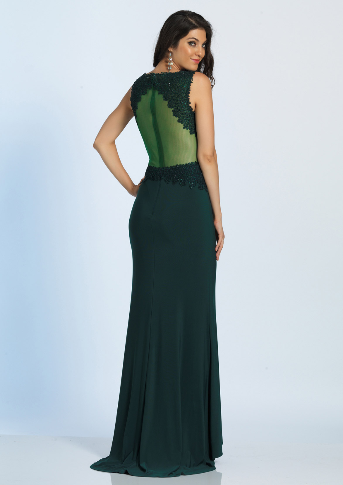 Dave and Johnny Prom Dress A4487. Long deep v-neck prom dress with a sheer back and beaded and embroidered details.Fabric: Beaded Lace Top/Jersey