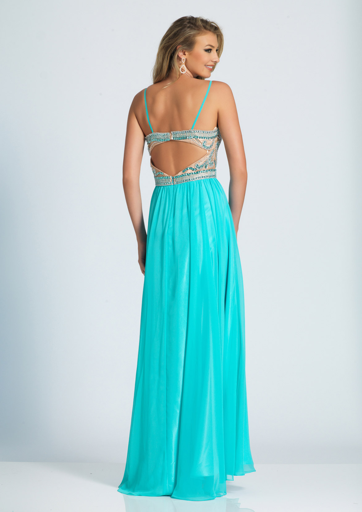 Dave and Johnny Prom Dress A4494. A Chiffon prom gown with a beaded bodice and spaghetti straps.