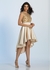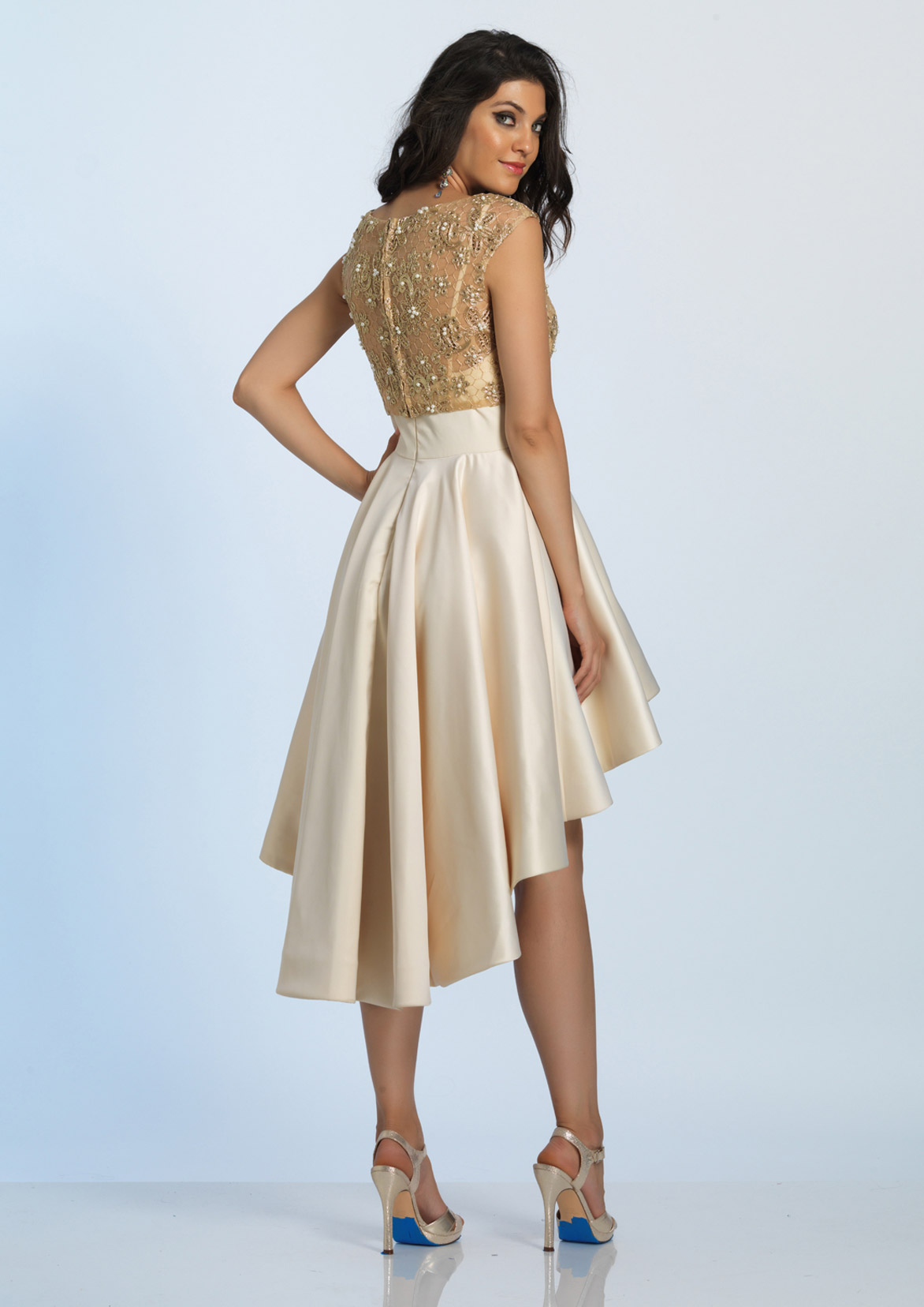 Dave and Johnny Prom Dress A4704. Brilliant beading adorns the illusion neckline with gilded leaflets atop the high waisted bodice. The flared skirt is ruffled in a hi-lo appeal with a short hemline over the front and elongated fabric in the back of this exciting dress.Fabric: Beaded Top over Satin