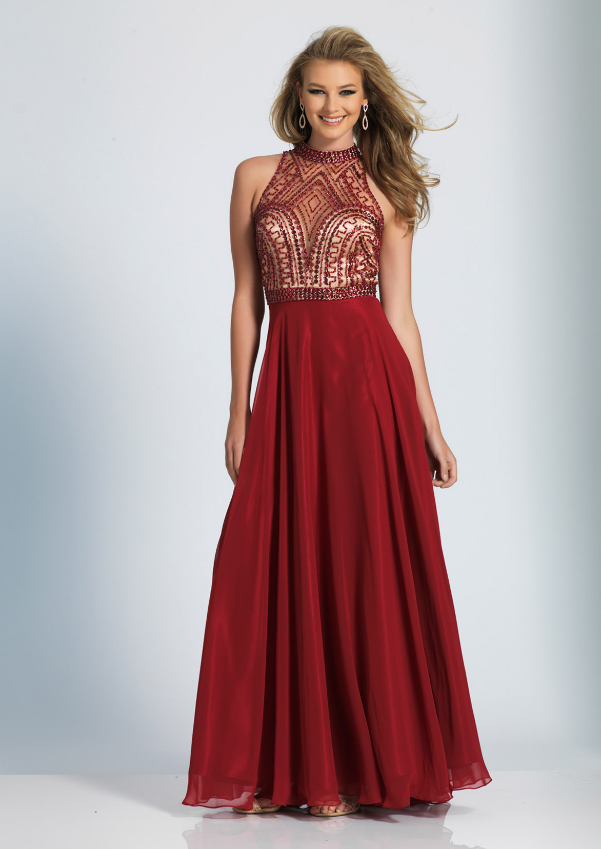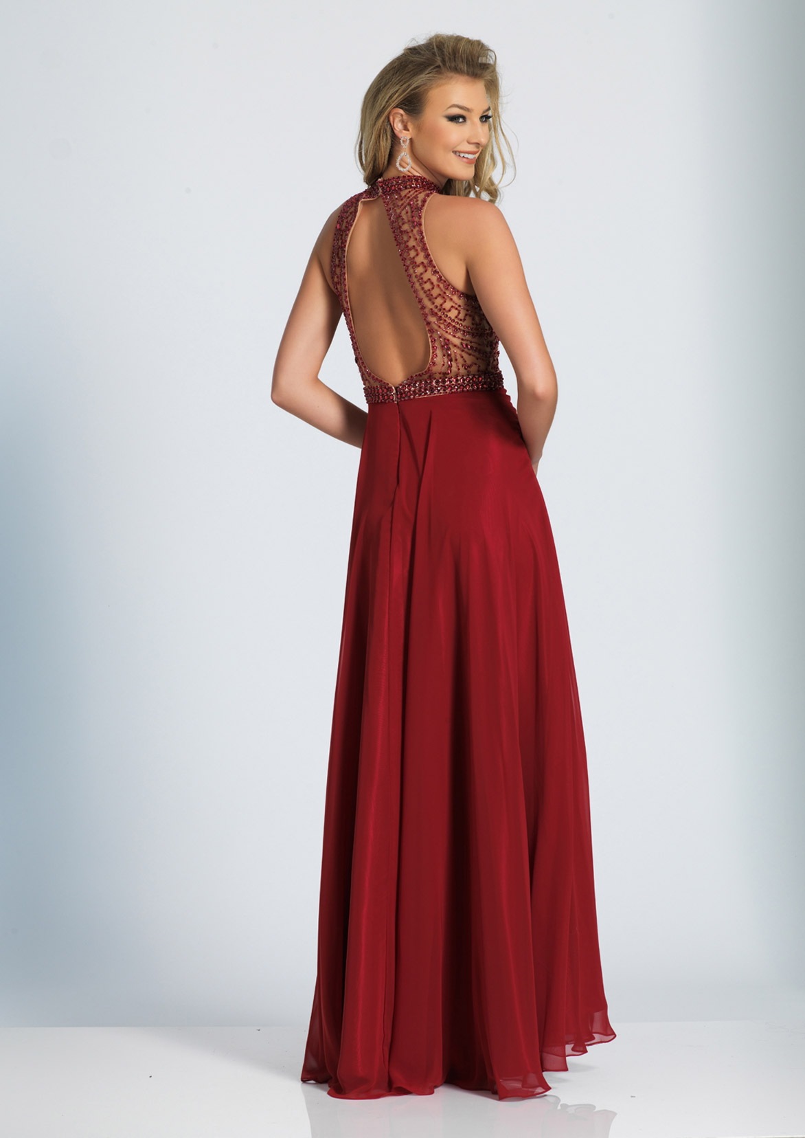 Dave and Johnny Prom Dress A4747. A high neck Chiffon prom gown with a sheer beaded bodice.