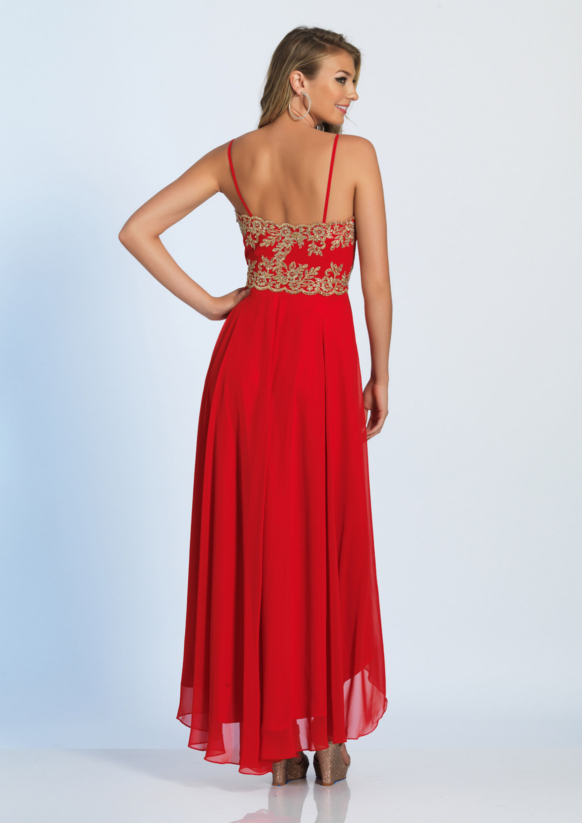 Dave and Johnny Prom Dress A4829. A high low Chiffon prom dress with spaghetti straps and Lace embellishment.Fabric: Lace Trim Top/Chiffon