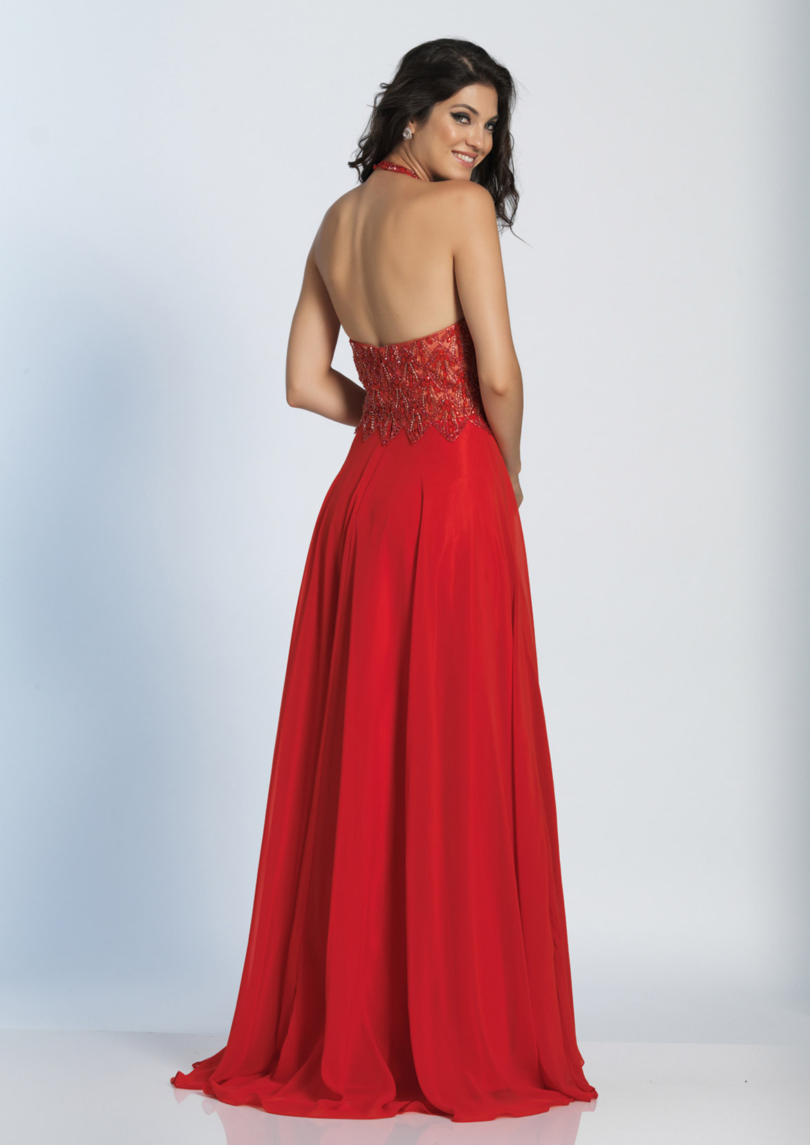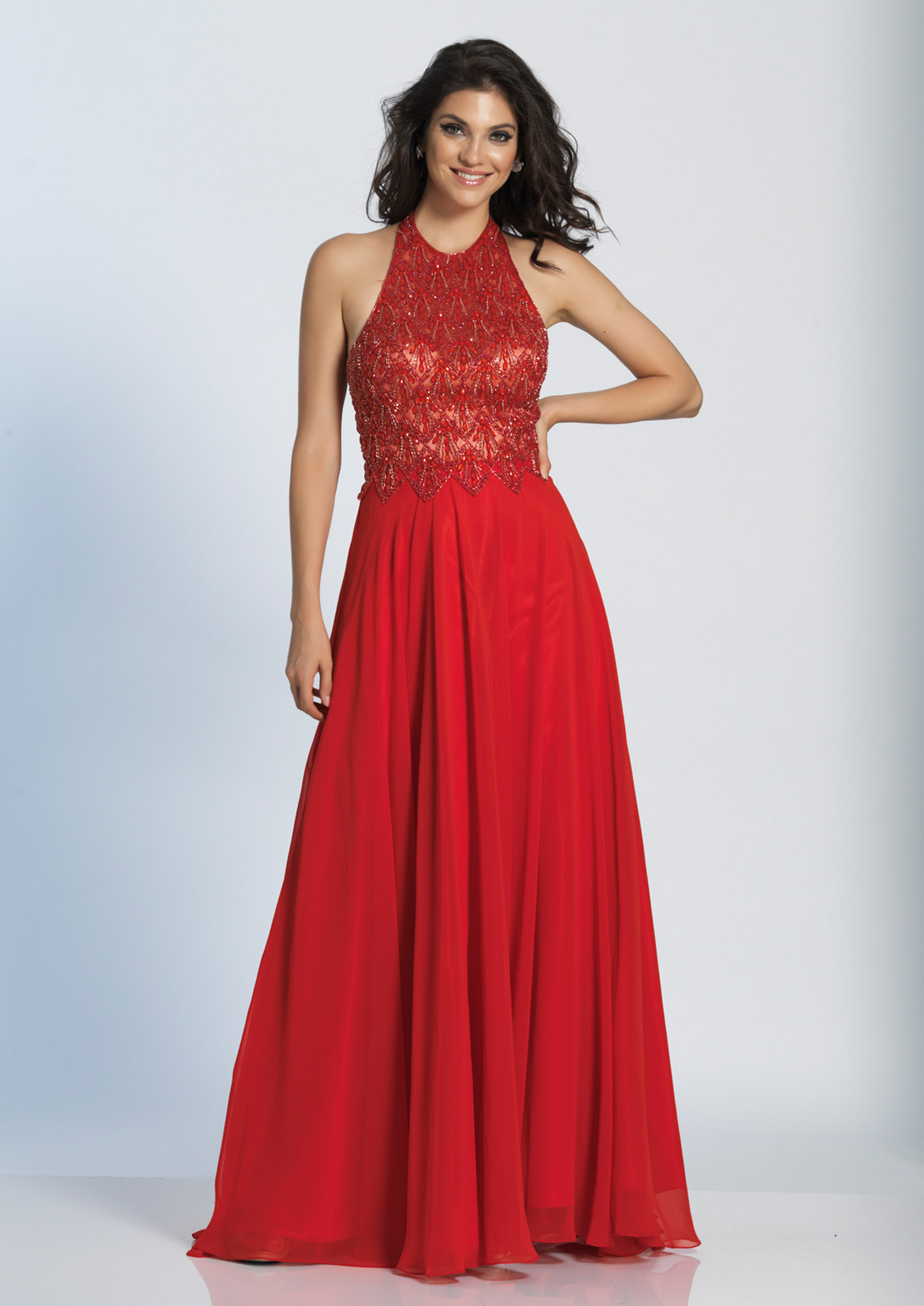 Dave and Johnny Prom Dress A5110. A halter Chiffon evening gown with a beaded bodice.