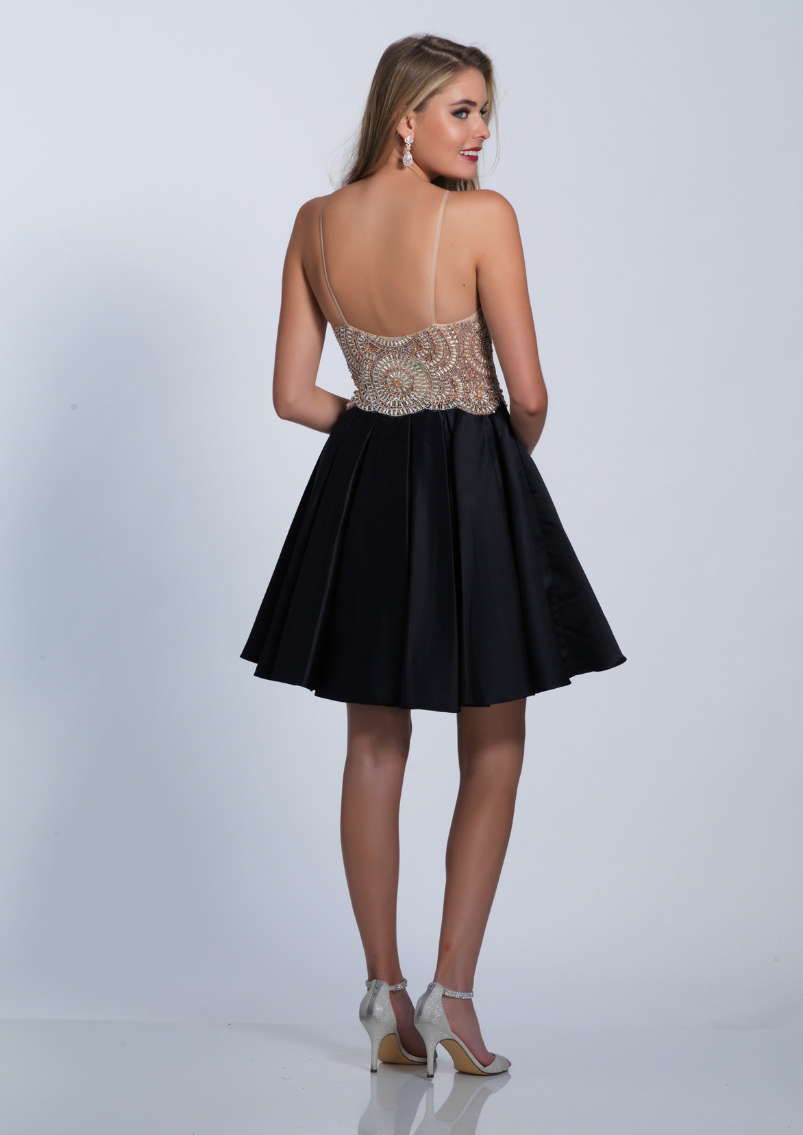 Dave and Johnny Prom Dress A5406. Short spaghetti strap homecoming dress with beaded bodice and pockets.