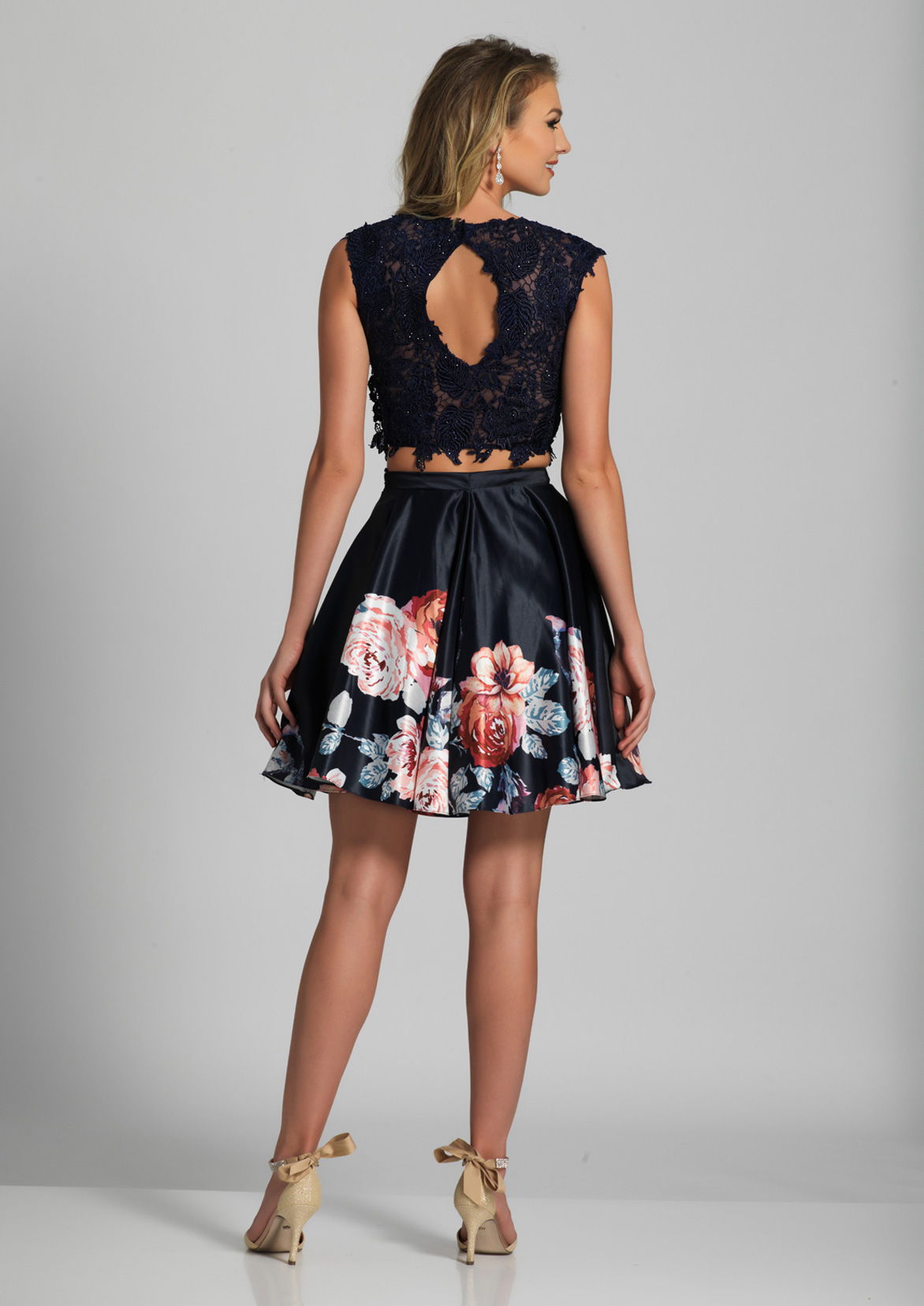 Dave and Johnny Prom Dress A5765W. Short two-piece floral print homecoming dress with lace top.