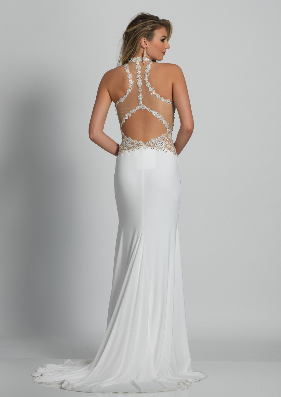 Dave and Johnny Prom Dress A5790. This dress boasts a high neckline with beaded appliques at the upper portion. This dress has a pronounced sweetheart shape with fine shimmering lace applique trim at the bodice. Sheer side panels flank the bodice. The skirt has a soft draped effect and finishes with a full length hem.As advertised from the manufacturer: www.Daveandjohnny.com.