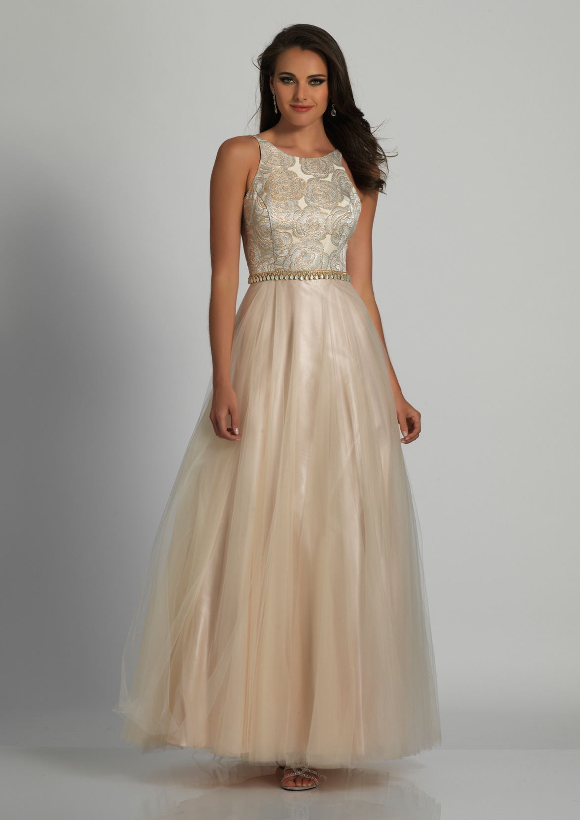 Dave and Johnny Prom Dress A5899. Sleeveless, this dress has a scoop neckline with tonal floral print and sparkling jewels at the nipped waist. The skirt is full with layers of tulle fabric. The gown finishes with a full length hem.As advertised from the manufacturer: www.Daveandjohnny.com.