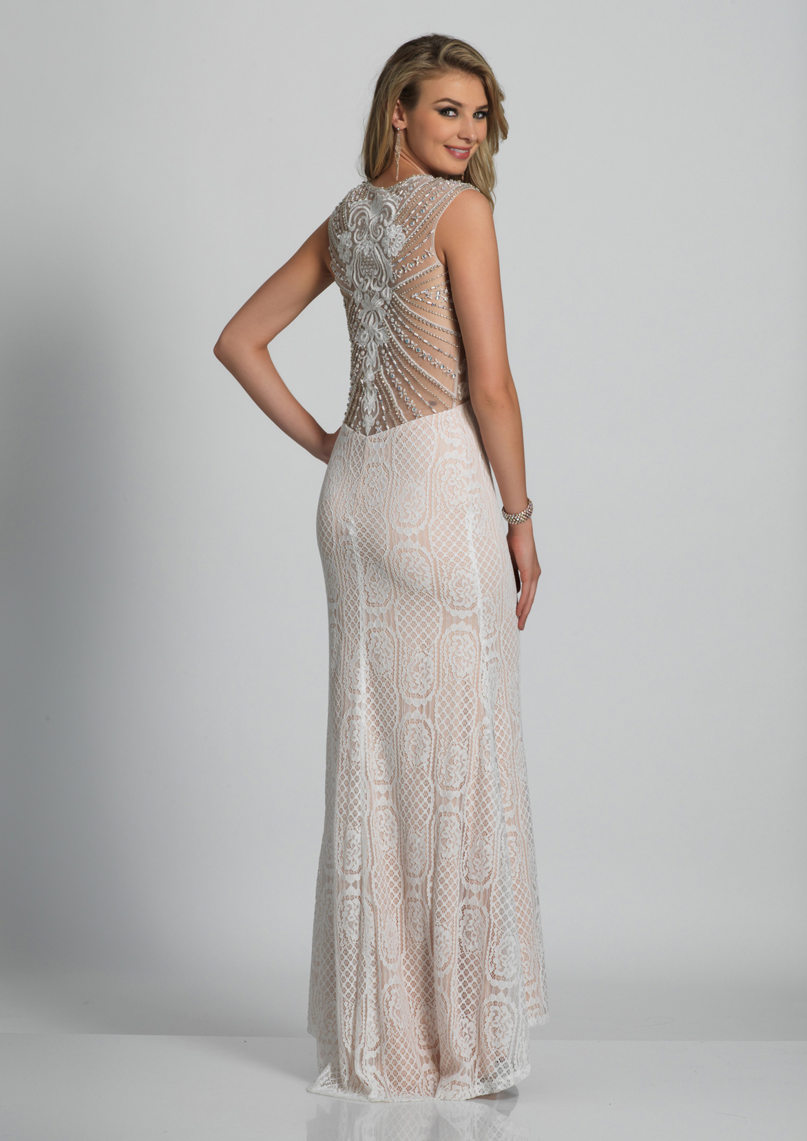 Dave and Johnny Prom Dress A5982. The sleeveless bodice has chic jewel neckline and is wrapped in romantic floral lace for a timeless and enchanting style. Slim fitting and made to show your shape, this decadent back embellished ensemble drapes to the full-length column silhouette hem in more waves of dreamy illusion lace.As advertised from the manufacturer: www.Daveandjohnny.com.
