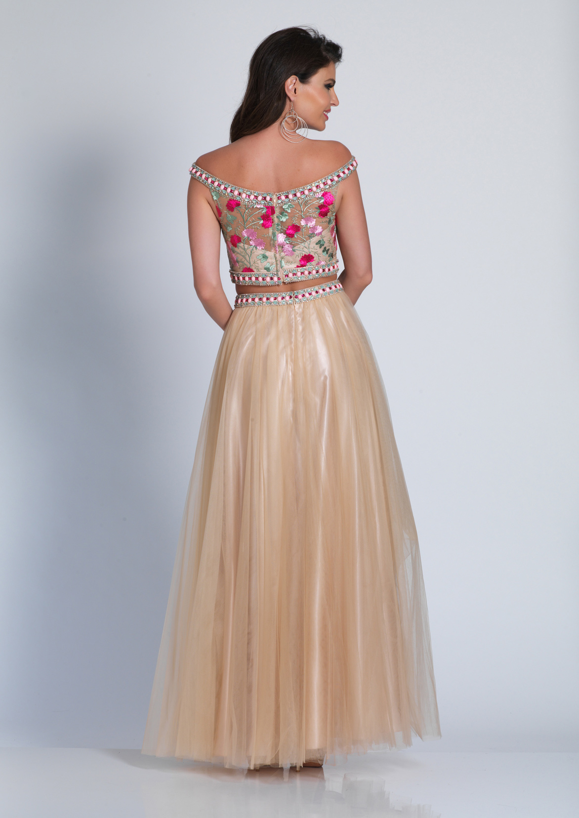 Dave and Johnny Prom Dress A6079. Lovely embellishments flow throughout the off shoulder style of this playful gown. The waist is given a bit of exposure before an embellished belt at the natural waistline frames the full and flirty layers of tulle that make up the full length skirt.As advertised from the manufacturer: www.Daveandjohnny.com.