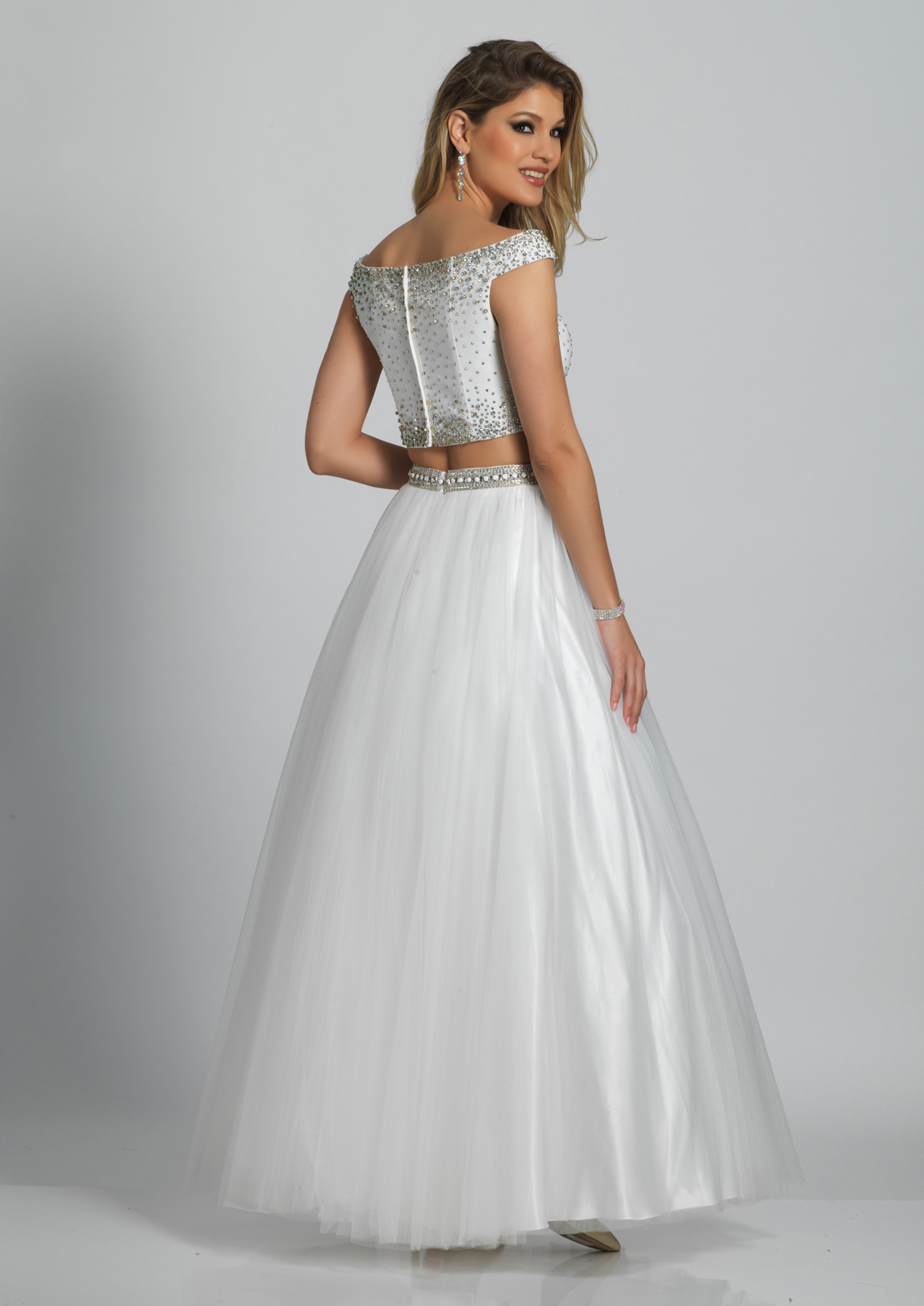 Dave and Johnny Prom Dress A6092. This dress is off-the-shoulder with crystal like bead works throughout the crop bodice. The waist is given a bit of exposure before an embellished belt at the natural waistline frames the full and flirty layers of tulle that make up the full length skirt.As advertised from the manufacturer: www.Daveandjohnny.com.