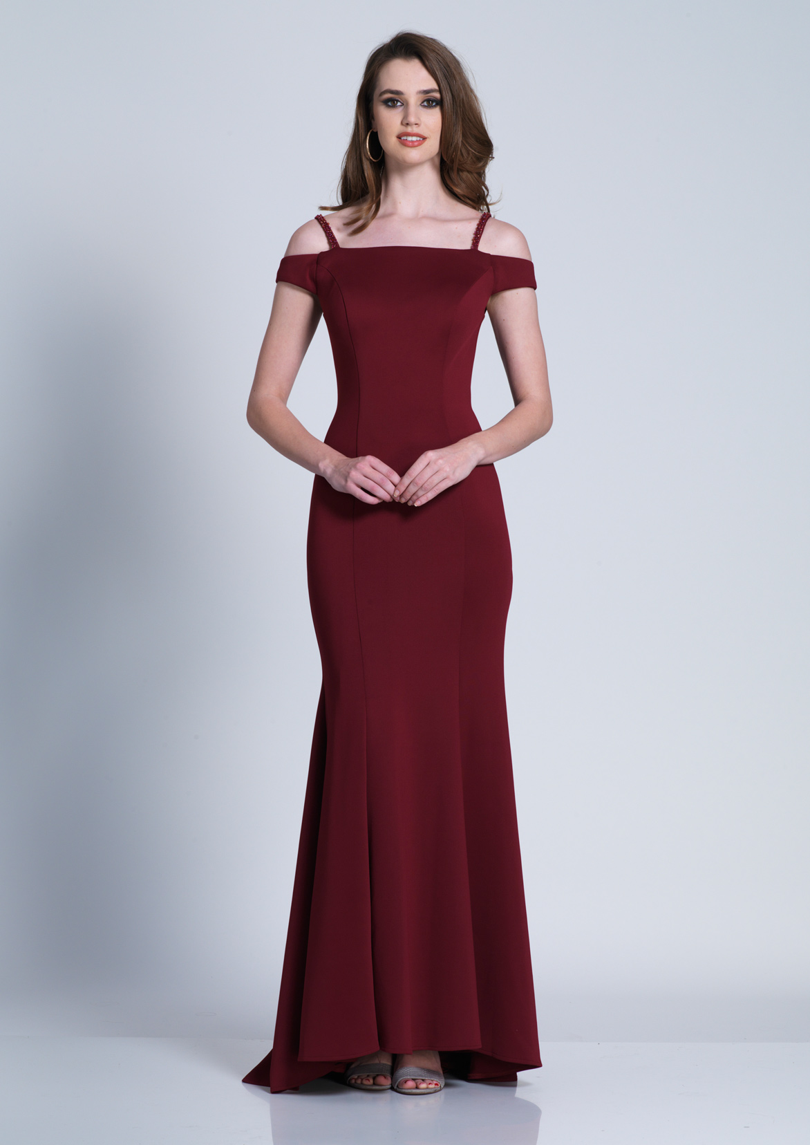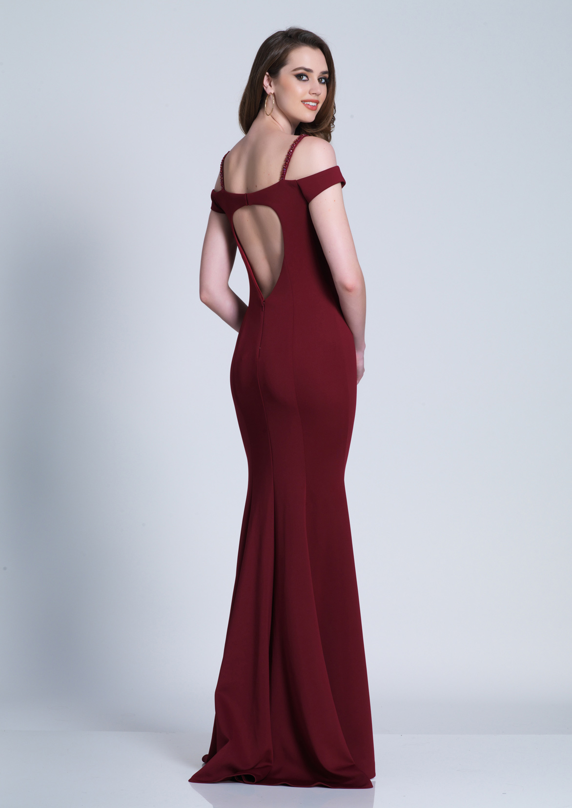 Dave and Johnny Prom Dress A6152. A fitted off the shoulder gown with spaghetti straps and a heart shaped cutout back.