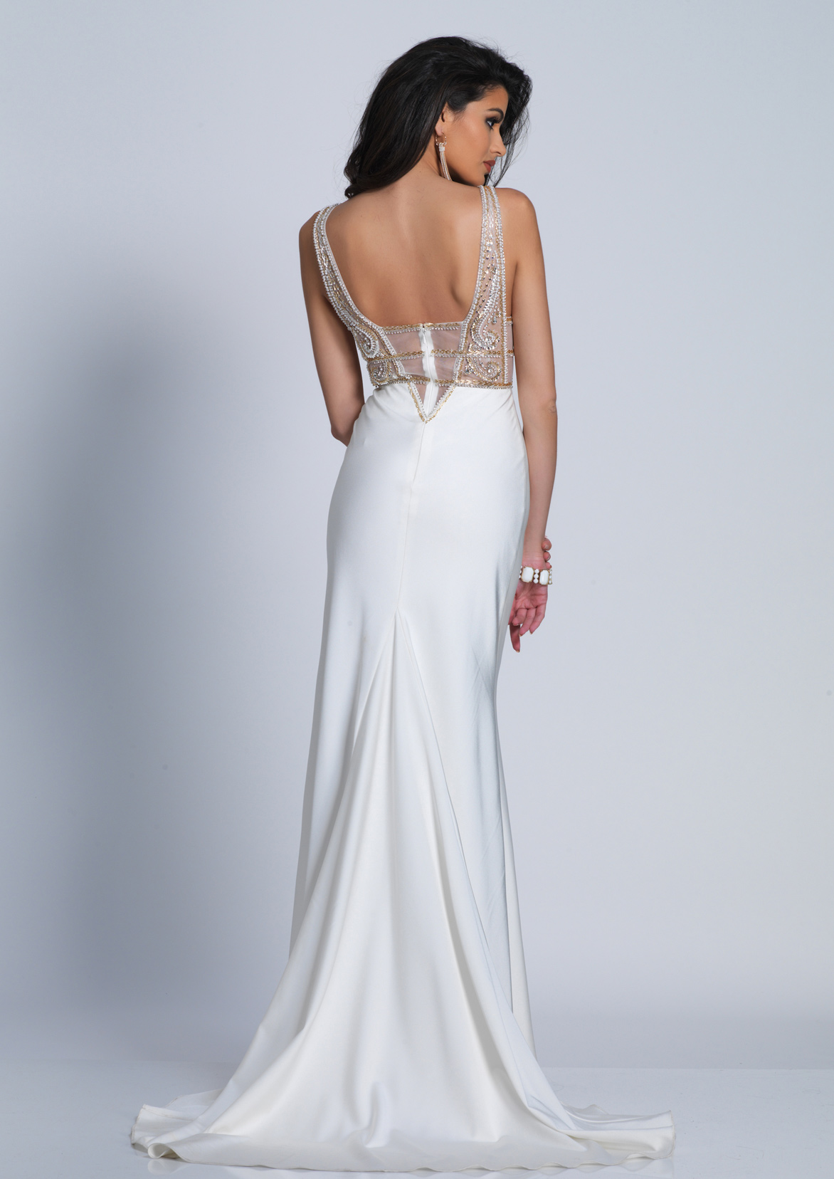 Dave and Johnny Prom Dress A6217. This sleeveless dress has a plunging V-neckline with modesty panel at the center of the bodice. Swirling embellishments beautify the bodice to a high waistline. The back has a low V-shape cut with sheer panel inset. The skirt has a soft flowing shape with a full length hem and a sweep train.As advertised from the manufacturer: www.Daveandjohnny.com.