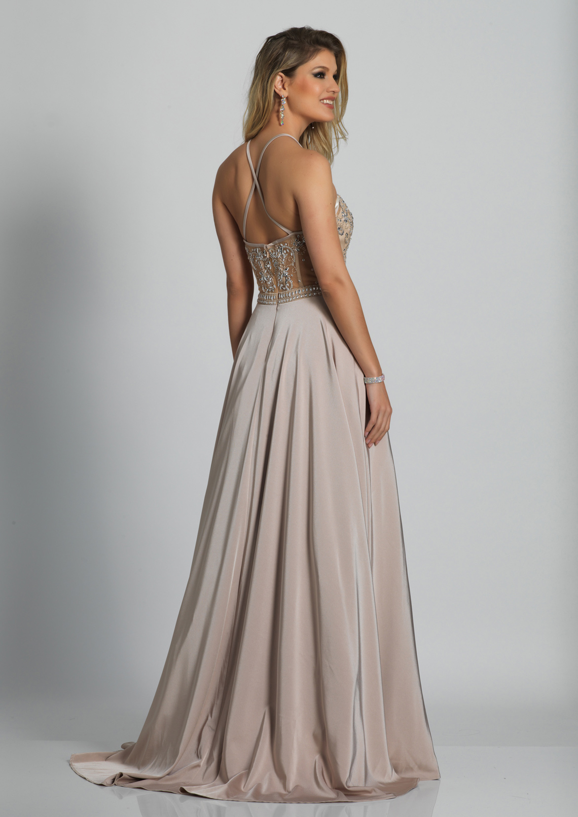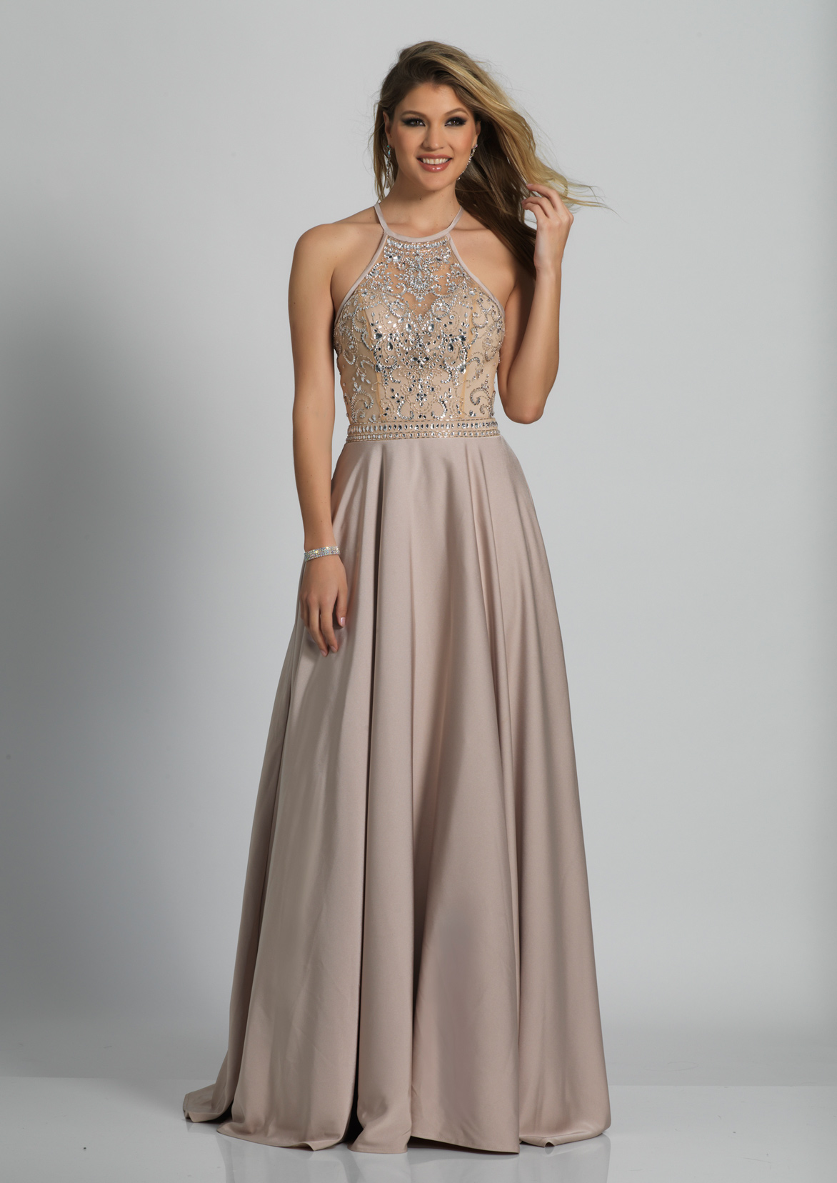 Dave and Johnny Prom Dress A6274. A slim strap holds the halter bodice at the neck and tailored lines define a custom-style fit. The embellished bodice is wrapped in a sheer fabric with underlining nude sweetheart lining. The fitted bodice continues to a glossy beaded waistband. The A-line skirt is shirred and dances to a full length with lush fabric and a wide flare for a gown you`ll want to wear again and again.As advertised from the manufacturer: www.Daveandjohnny.com.