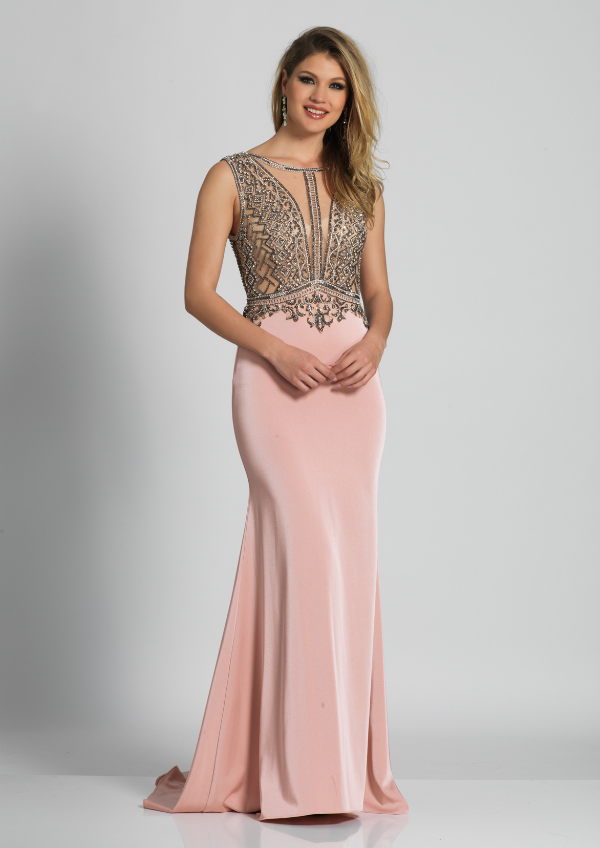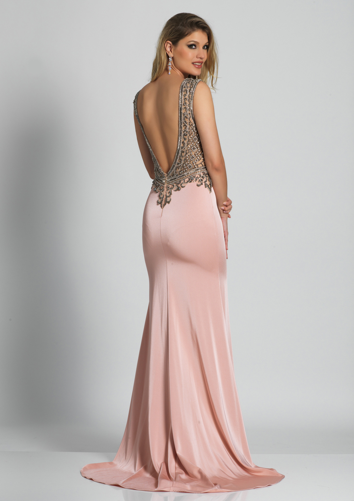 Dave and Johnny Prom Dress A6422. A sleeveless evening gown with sheer beaded bodice and open back.