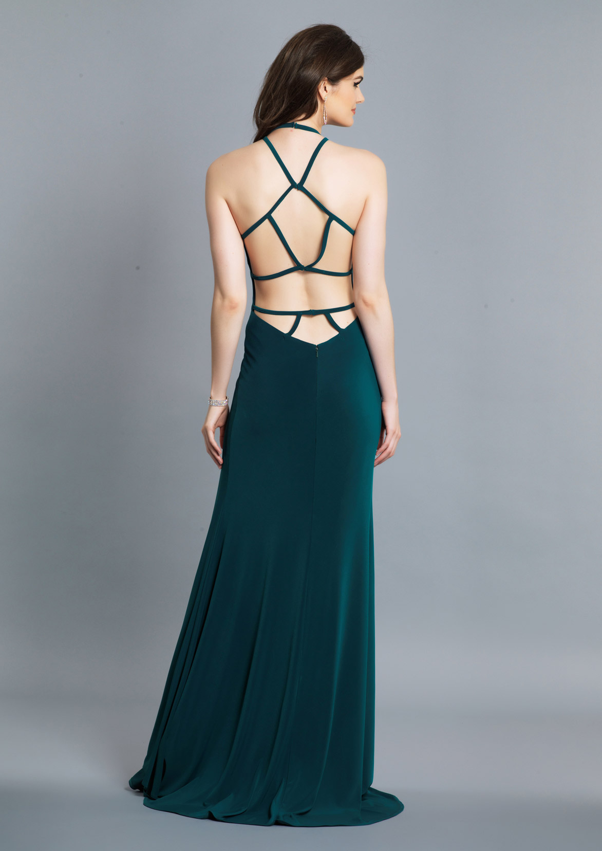 Dave and Johnny Prom Dress A7149. A high neck spaghetti strap evening dress with leg slit and strappy back.Color Samples
