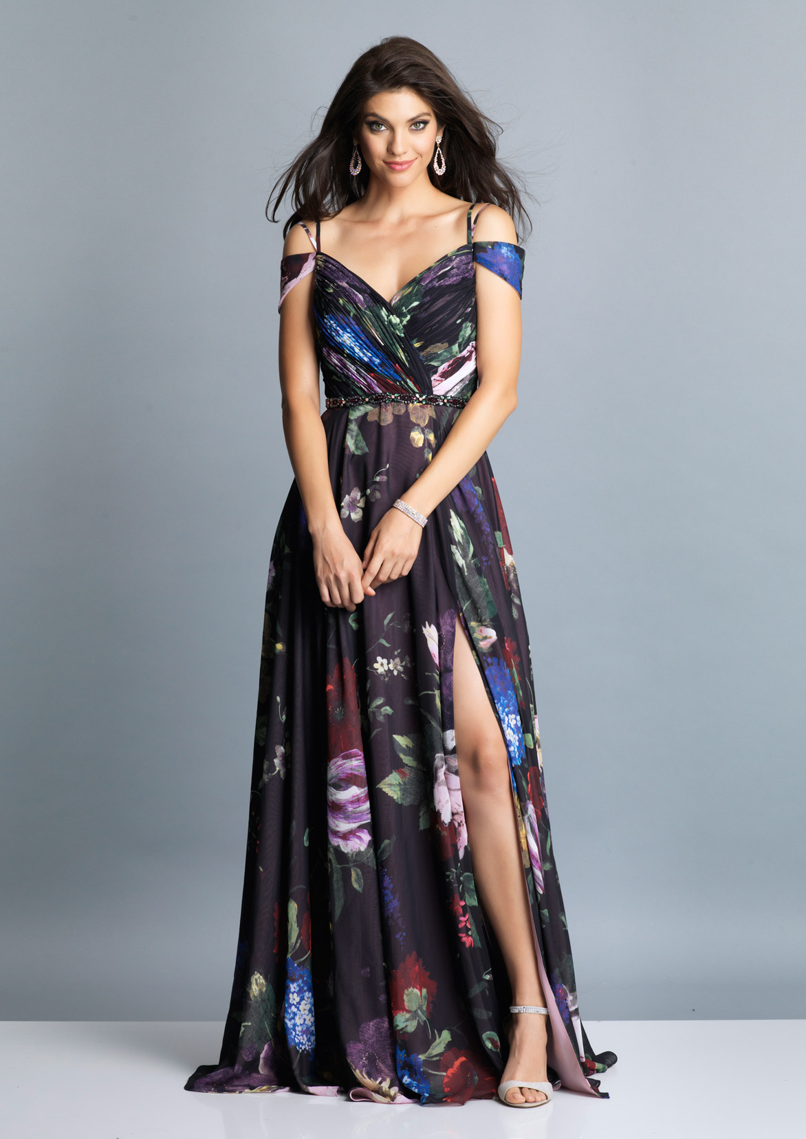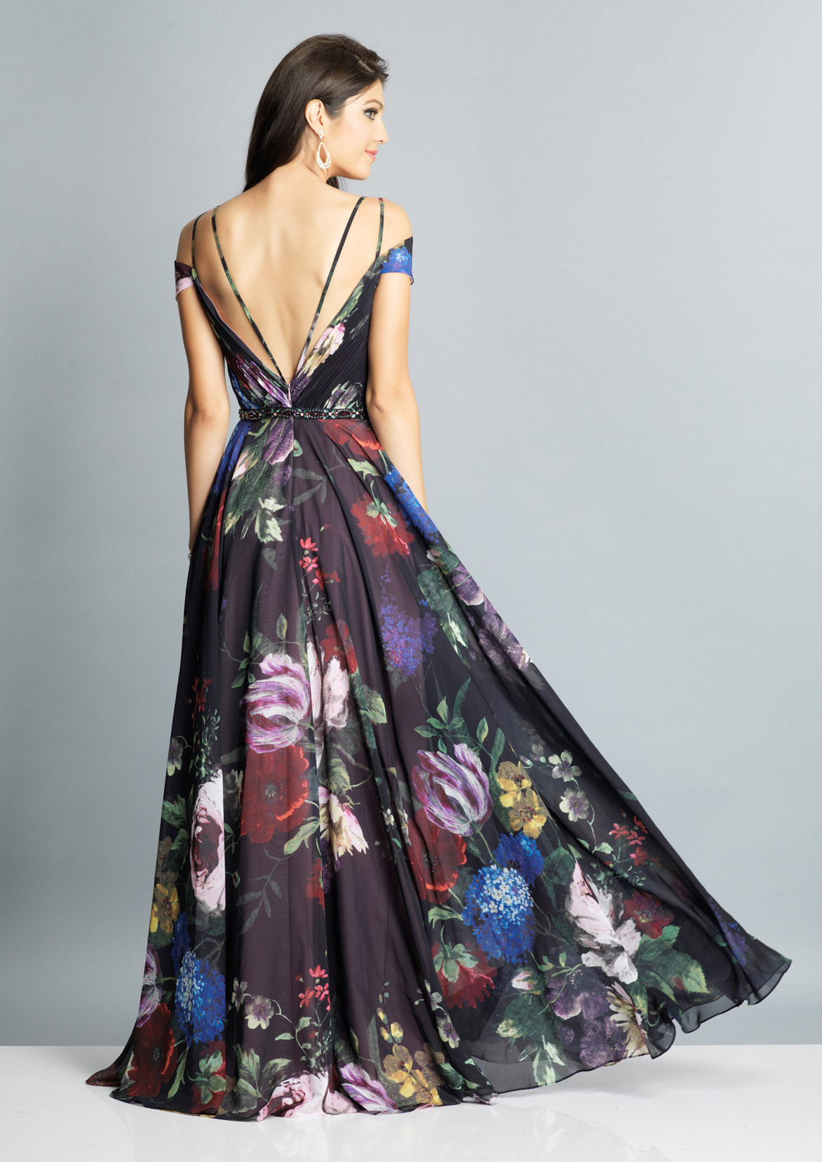 Dave and Johnny Prom Dress A7216. A V neck off the shoulder with spaghetti strap floral print evening dress with open back.