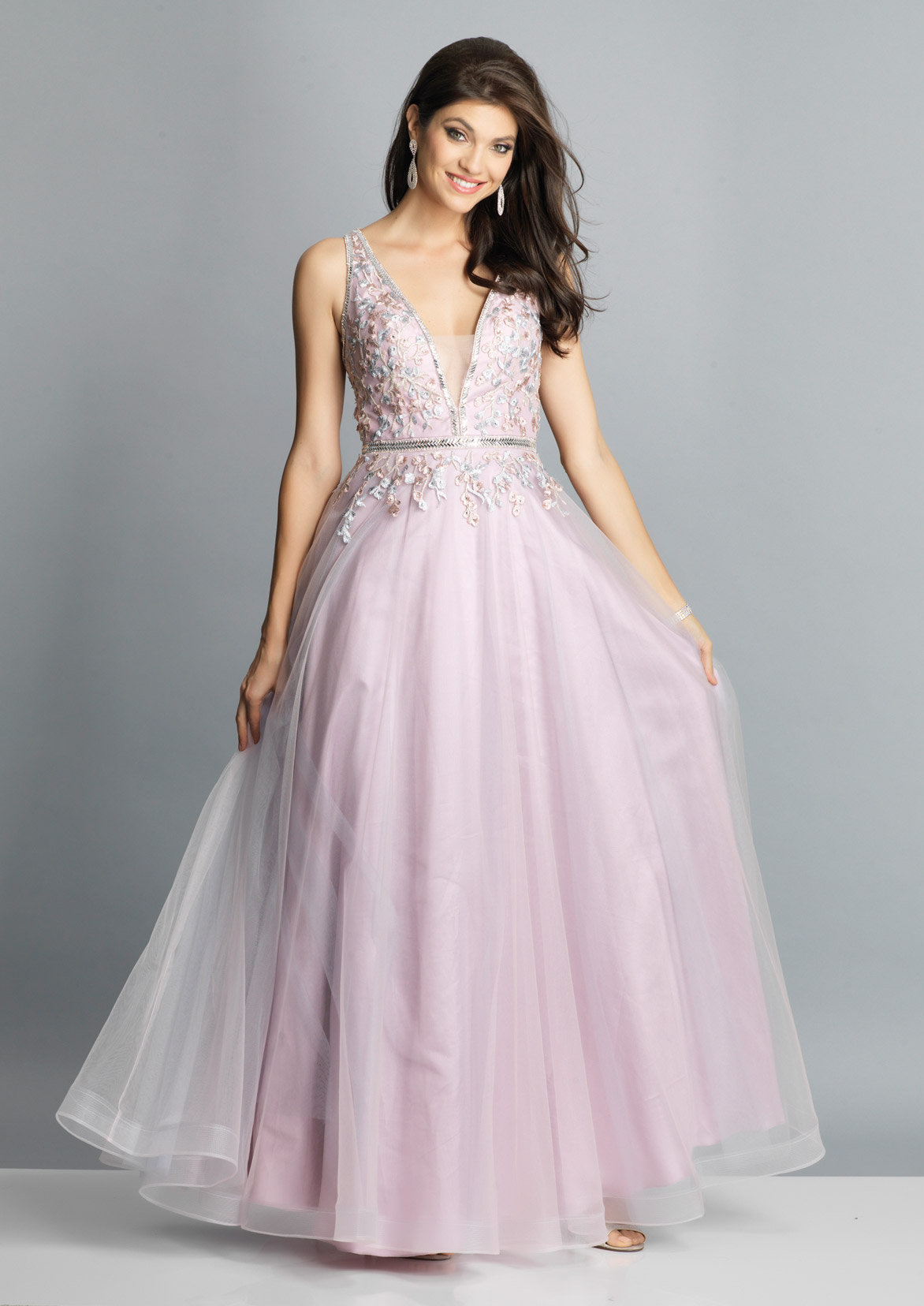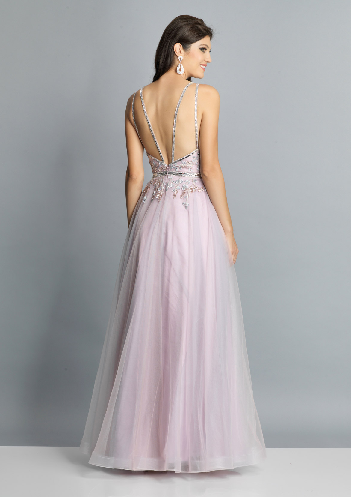 Dave and Johnny Prom Dress A7927. A V neck with illusion narrow strap embellished bodice long prom dress with strappy back.