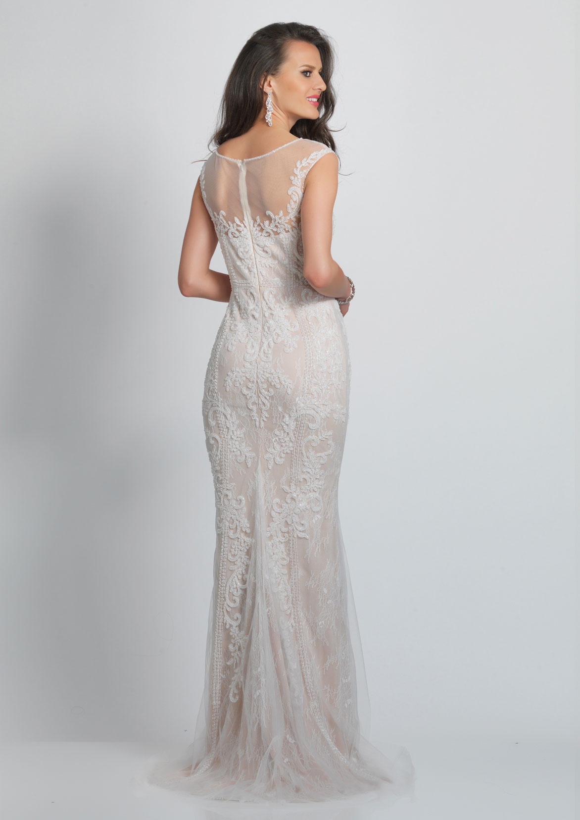 Dave and Johnny Prom Dress A8442W. A lace overlay fitted gown with an illusion neckline.
