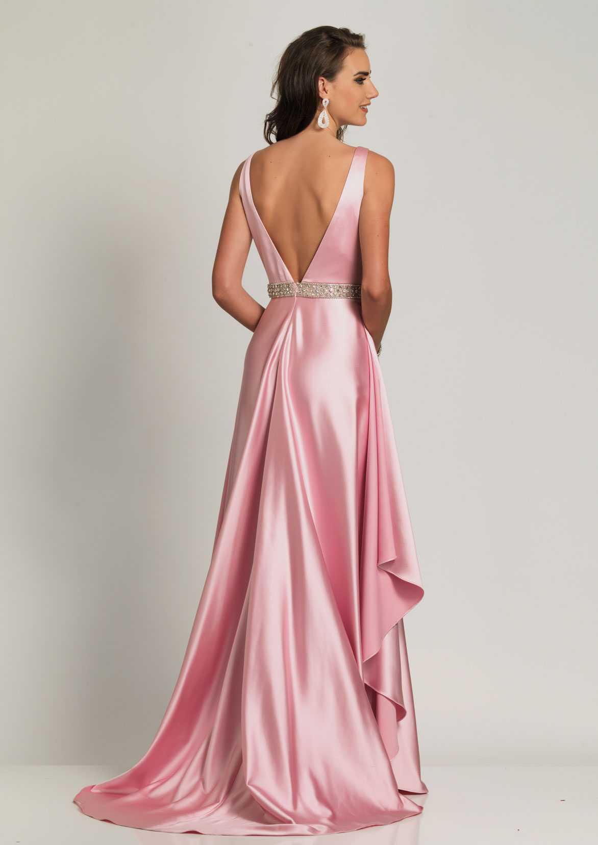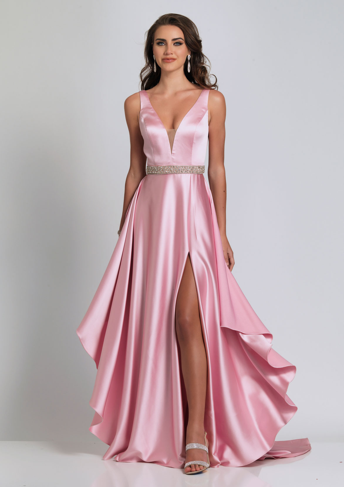 Dave and Johnny Prom Dress A8485. Lavishly sculpted with contouring seams on a rich satin fabric, this gown flaunts a plunging v-neckline with an illusion inset. This sleeveless stunner flourishes a plunging v-open back. A bejeweled band embraces the natural waist. The A-line skirt flutters at the sides as the front parts with slit and sweep train.As advertised from the manufacturer: www.Daveandjohnny.com.