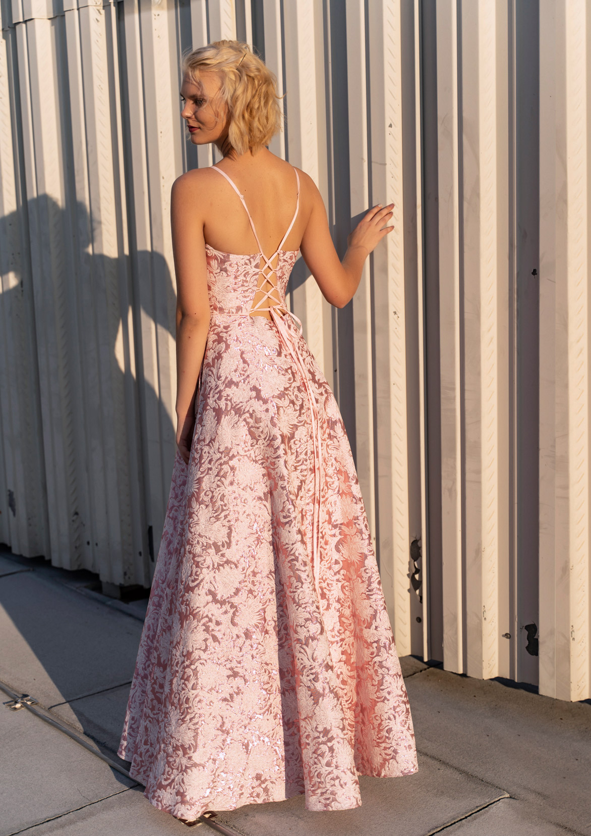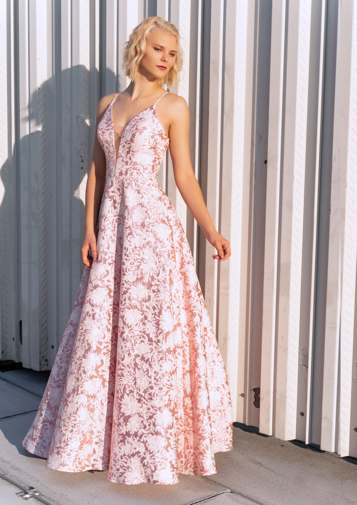 Dave and Johnny Prom Dress A8514. A floral brocade ballgown with a tie up back.