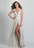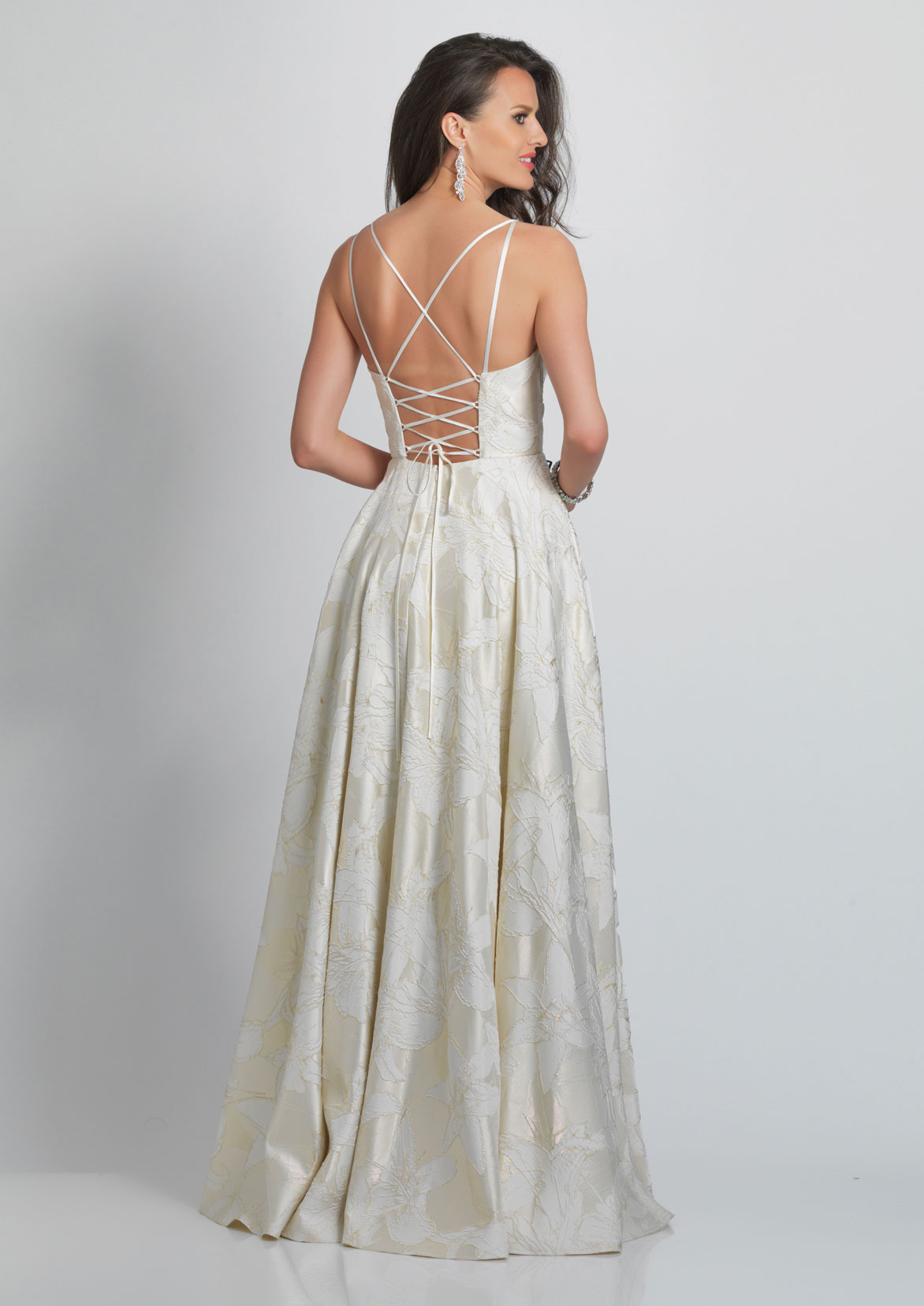 Dave and Johnny Prom Dress A8552. A plunging V neckline with sheer inset detail at the bust bisects the sleeveless bodice supported with spaghetti straps which criss cross the open back. Designed in floral jacquard fabric, this dress features an a-line skirt which gracefully falls to a full length hemline.As advertised from the manufacturer: www.Daveandjohnny.com.