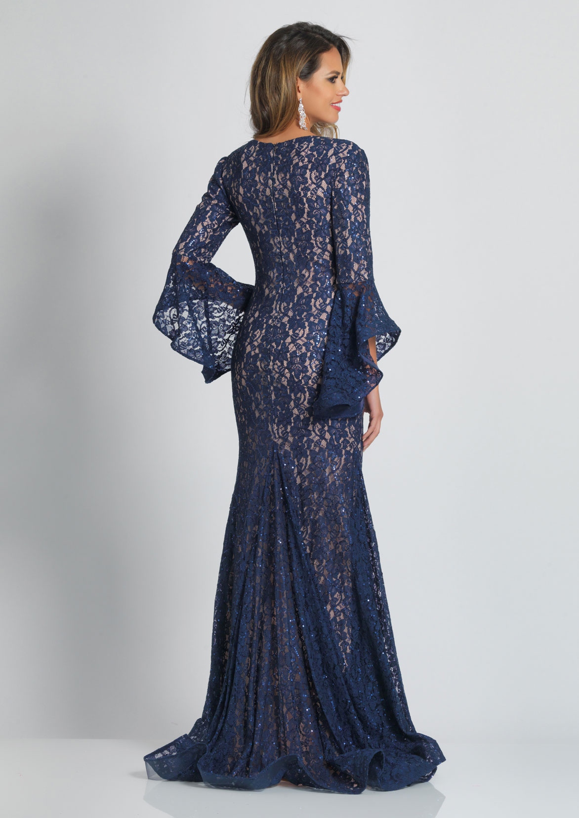 Dave and Johnny Prom Dress A8589. A lace long bell sleeve gown with a nude underlay.